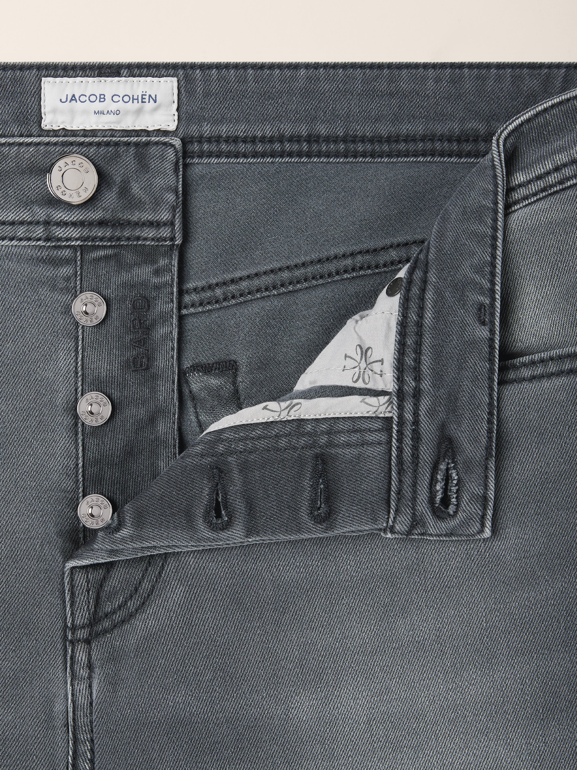 - Dunkelgrauer Power Stretch Denim mit Waschung in Vintage-Optik, Whiskern und Handbearbeitung mit Sandpapier (11,5 Unzen)