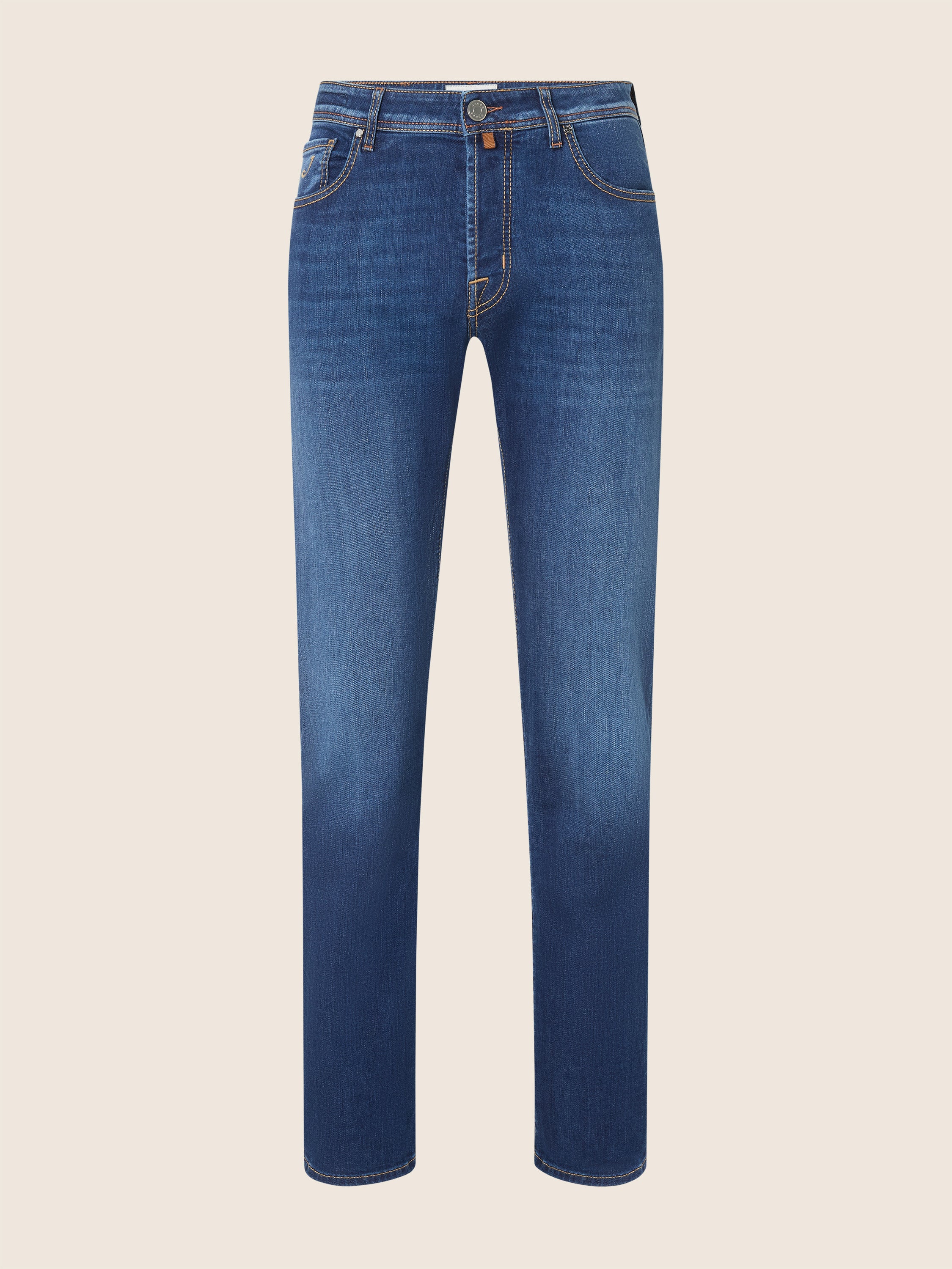 - Super Stretch Denim in einem mittleren Blauton mit Enzymwaschung, Whiskern und weicher Textur (10 Unzen)