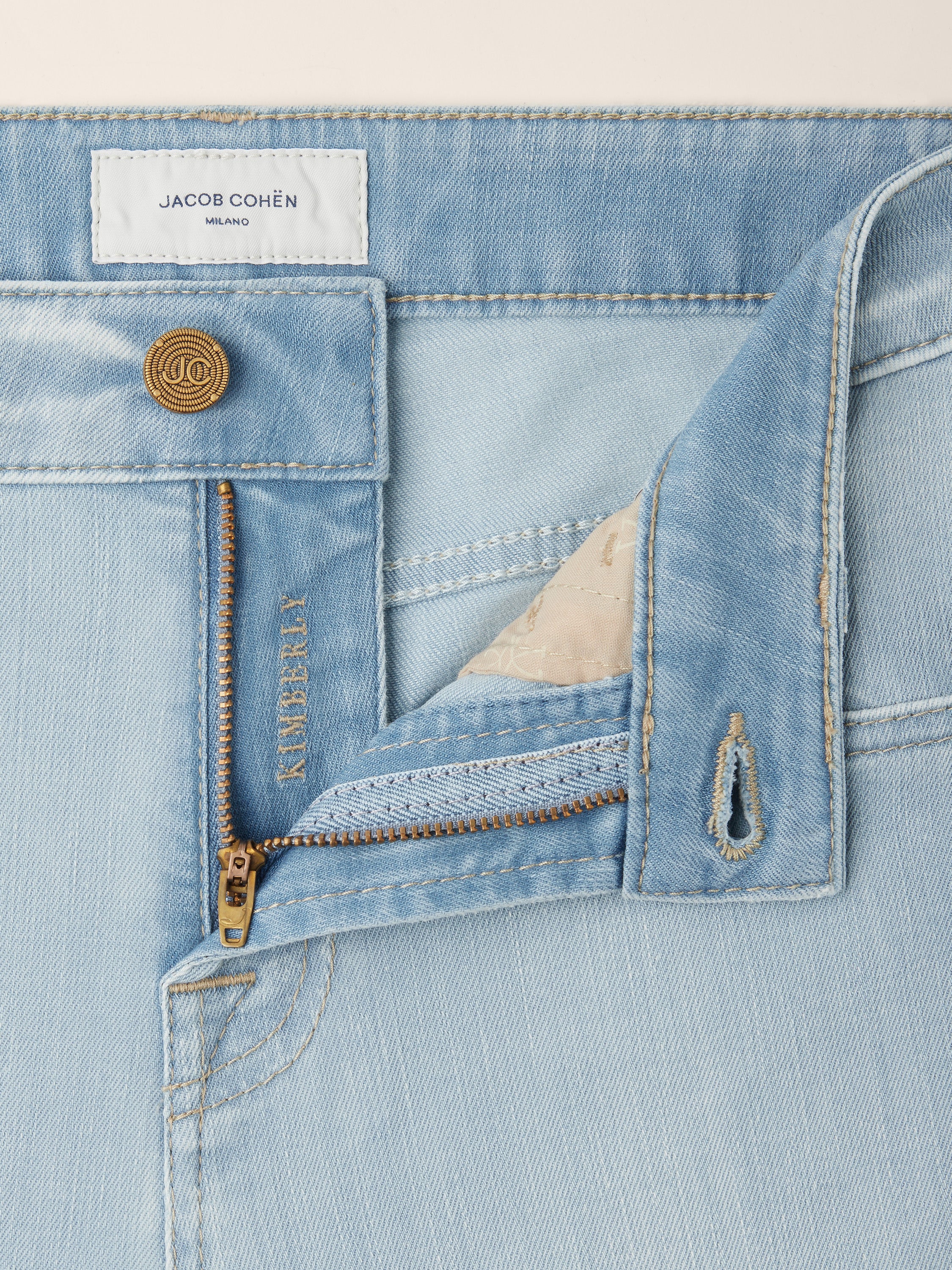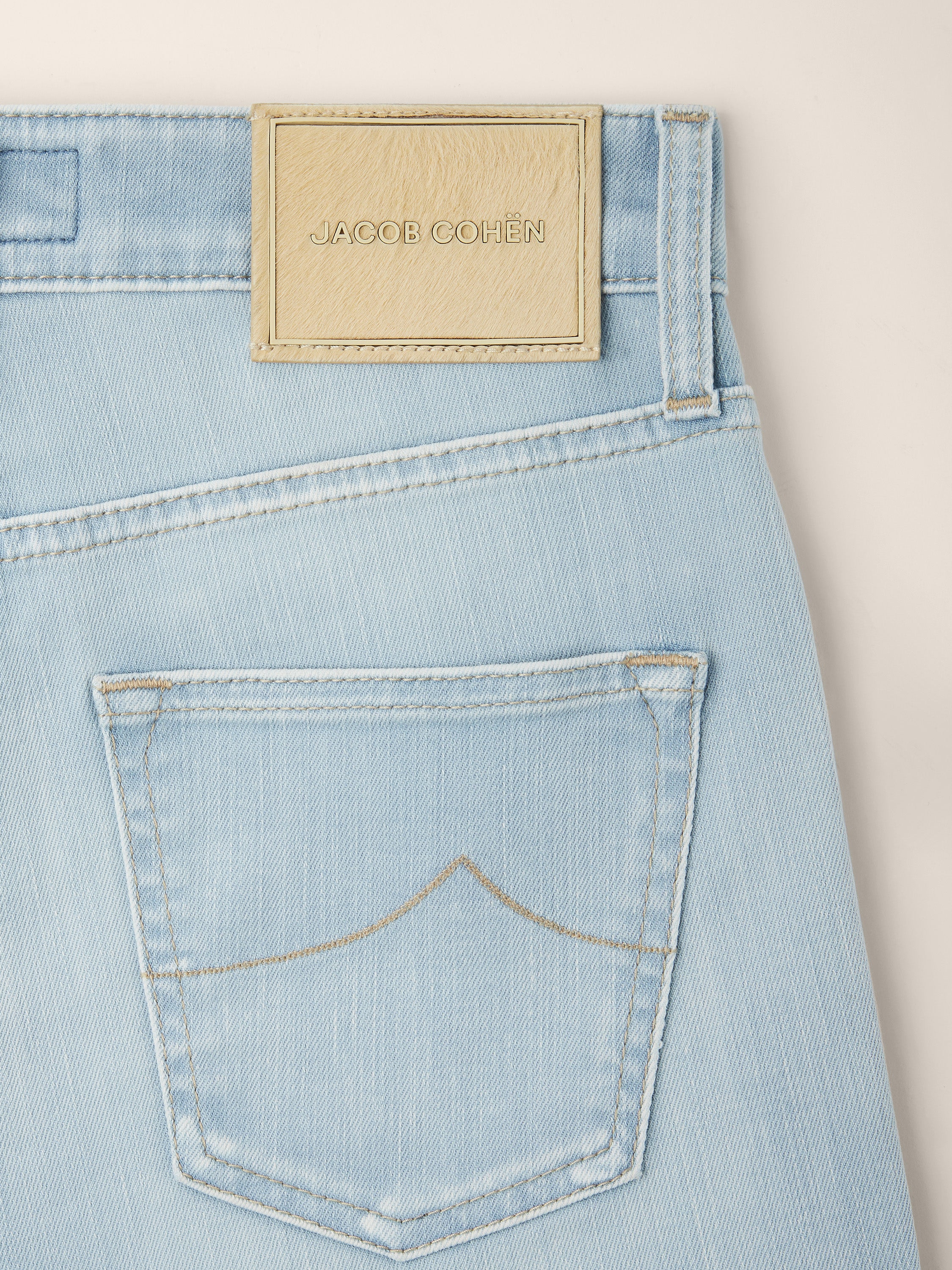 • Light blue cotton and lyocell comfort denim with stone bleach wash, hand sanded (8.5 ounces)