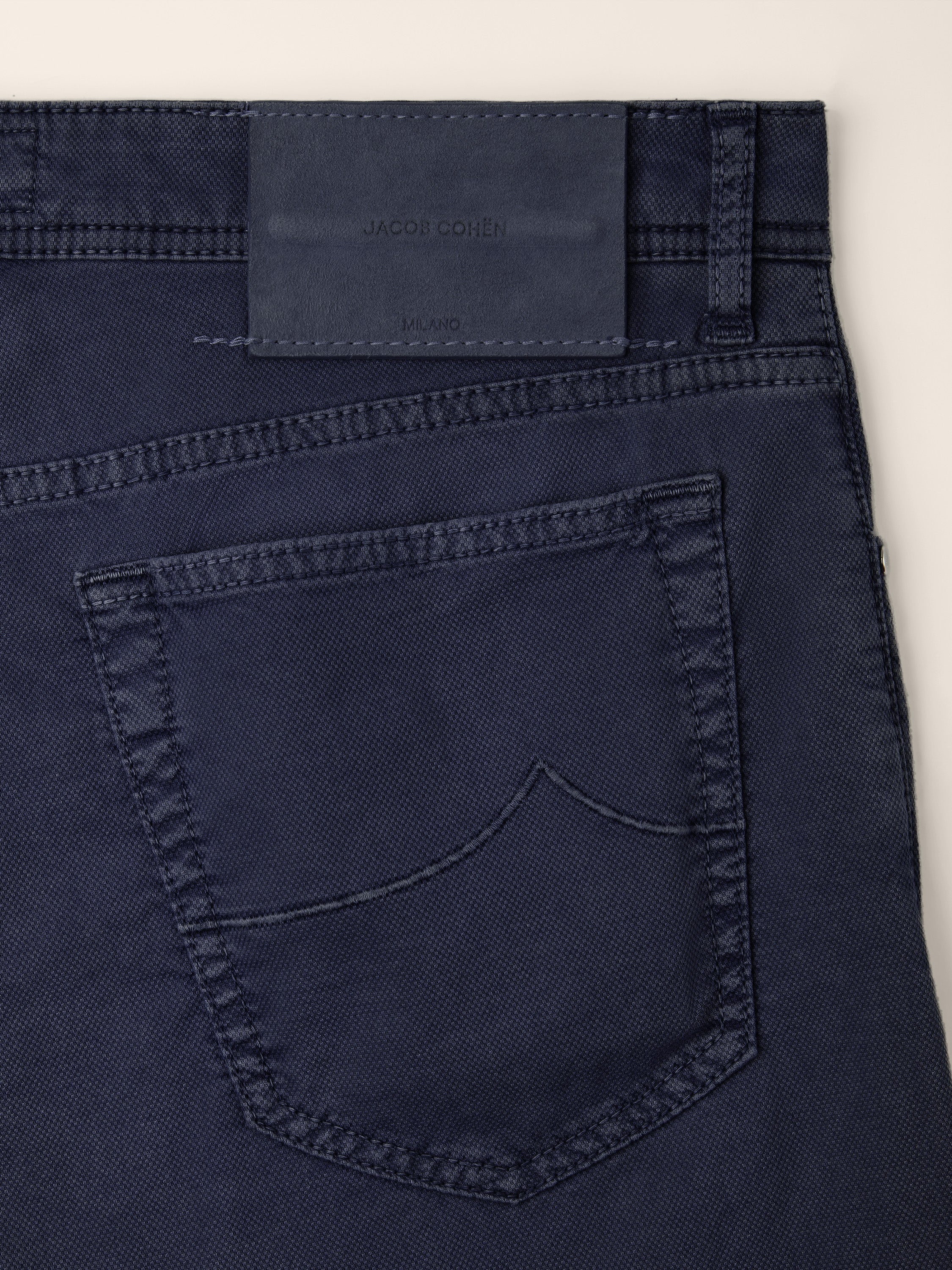 • Caribbean blue stretch-cotton fabric with micro honeycomb texture, garment-dyed