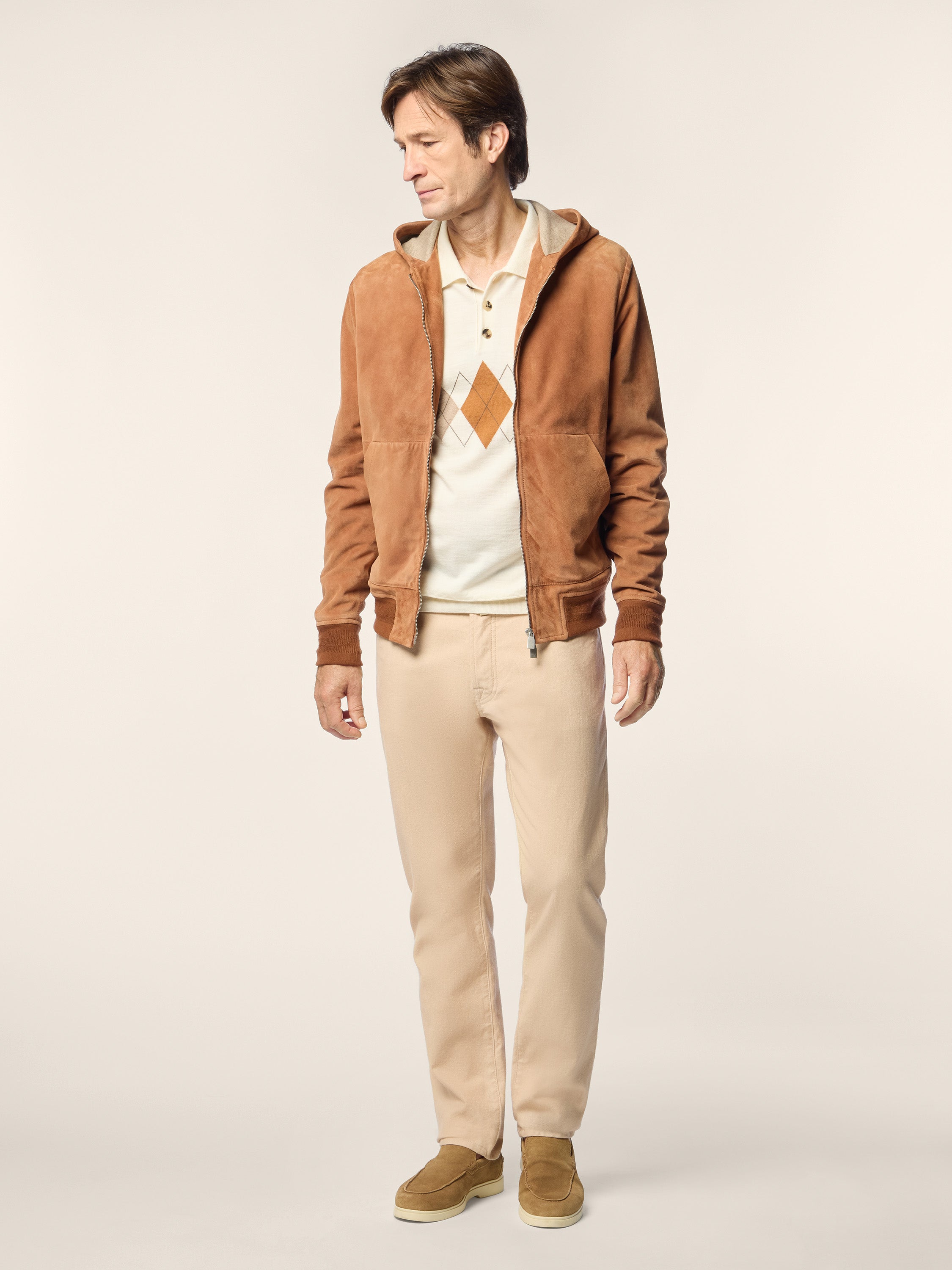 • Calf-hair back patch with Alcantara fabric argyle motif in shades of white, orange and apricot, enriched with a tonal embroidery and nickel-tone metal logo