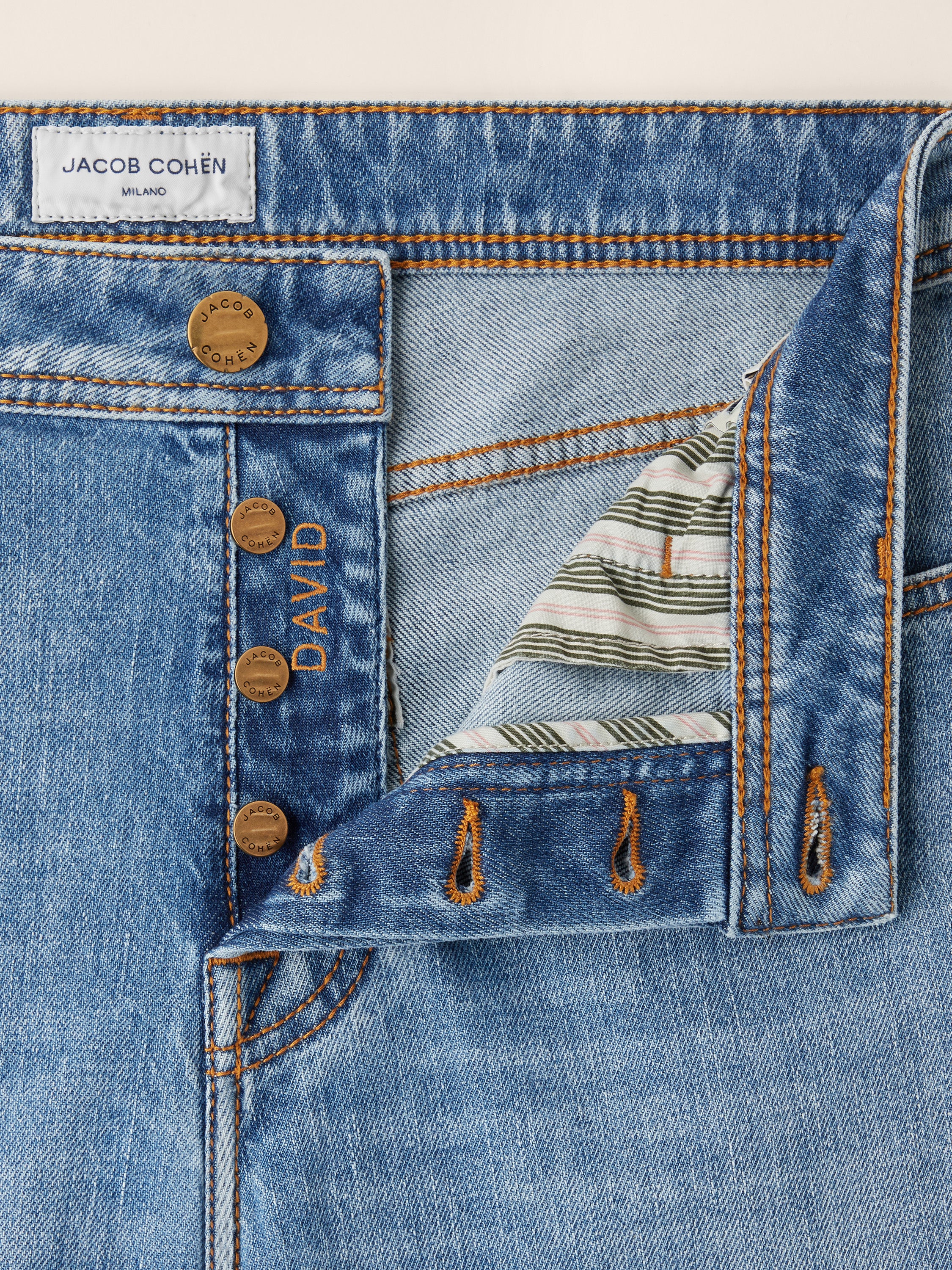 • Medium blue comfort denim with a vintage-effect stone bleach wash, hand-sanded (10 ounces)