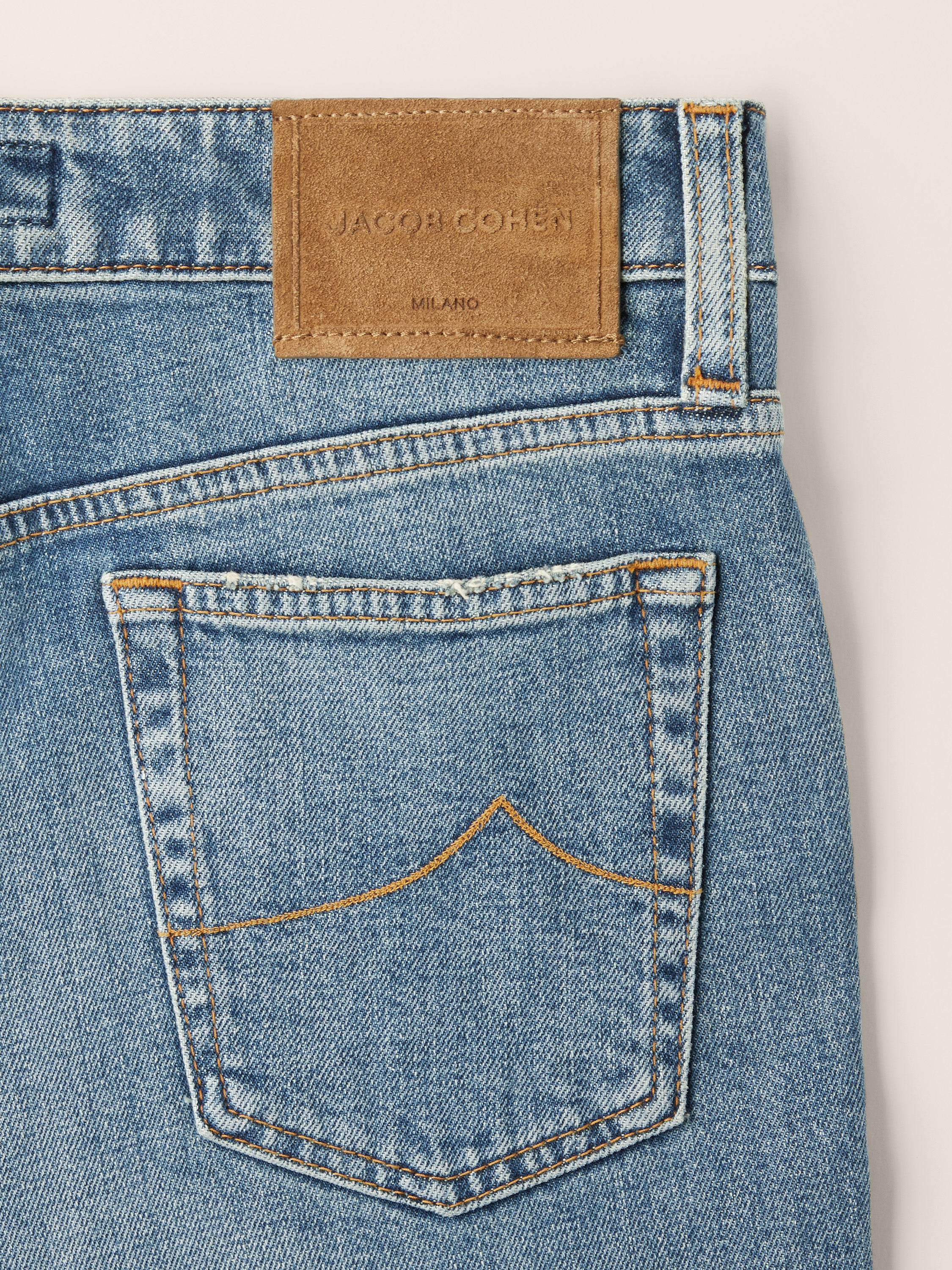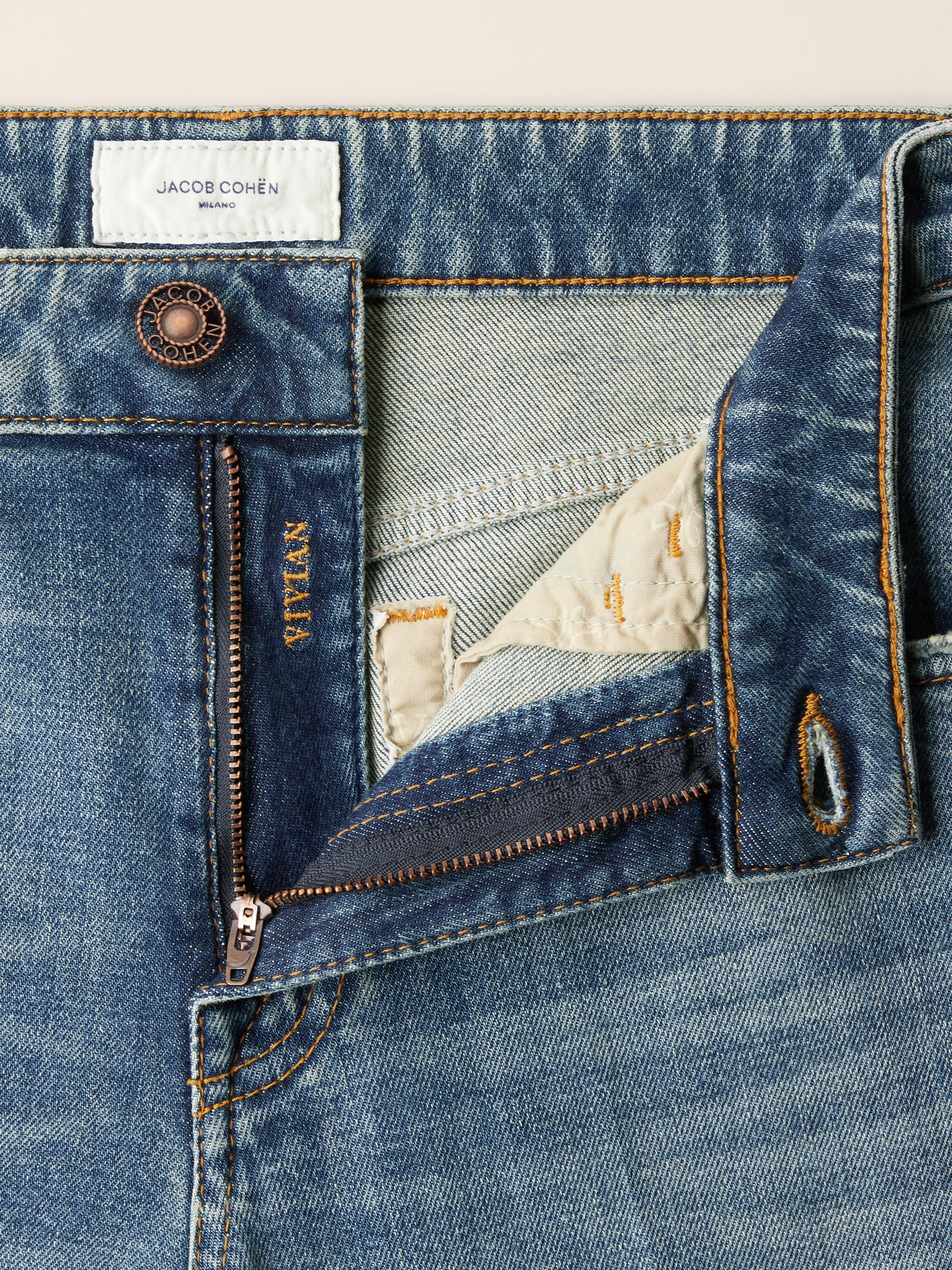 - Medium blue cotton and lyocell comfort denim with a vintage-effect stone bleach wash, hand-sanded and enriched with whiskers, mended abrasions, and a dirt-effect finish (11 ounces)