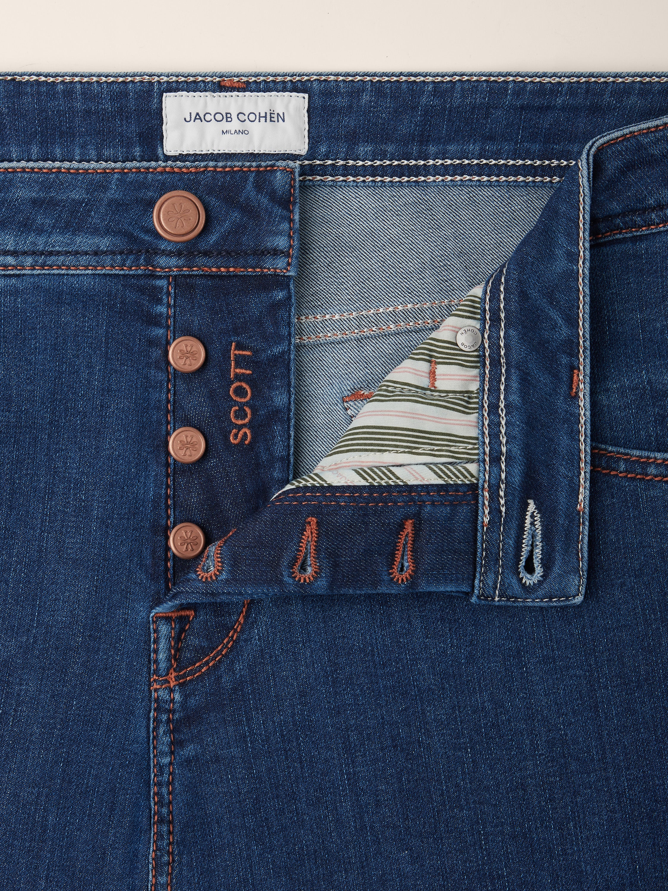 • Dark blue super stretch denim with stone rinse wash, enriched with subtle bleach effects on the upper part of the jean and mineral pigment treatments, hand-sanded (10 ounces)