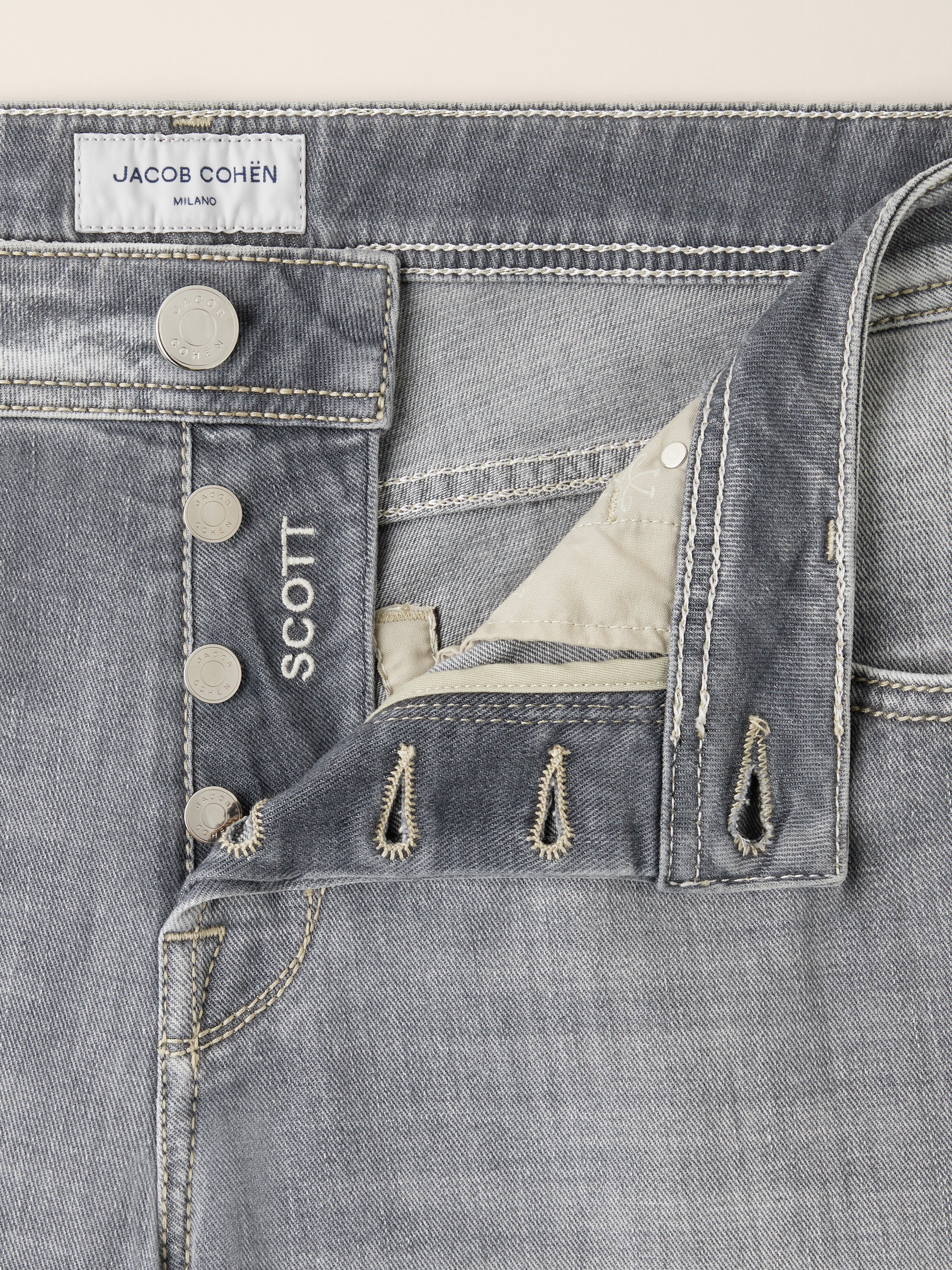 • Light black super stretch denim with a vintage-effect stone wash, enriched with bleach treatments, a light dirt-effect finish, and hand-sanded (9 ounces)