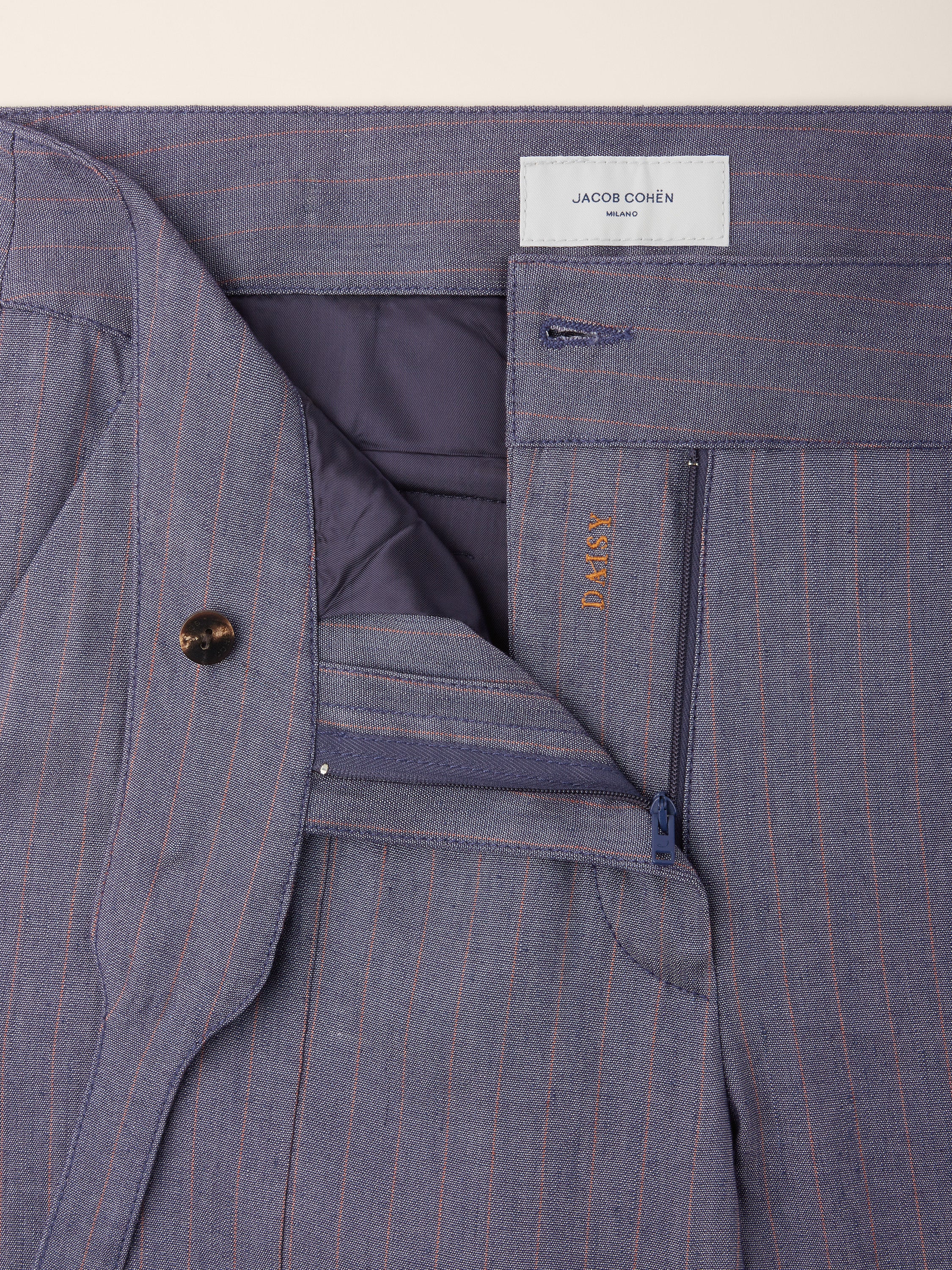 Daisy Regular Trousers in Navy Blue and Burgundy Pinstripe Viscose and Linen Stretch Canvas