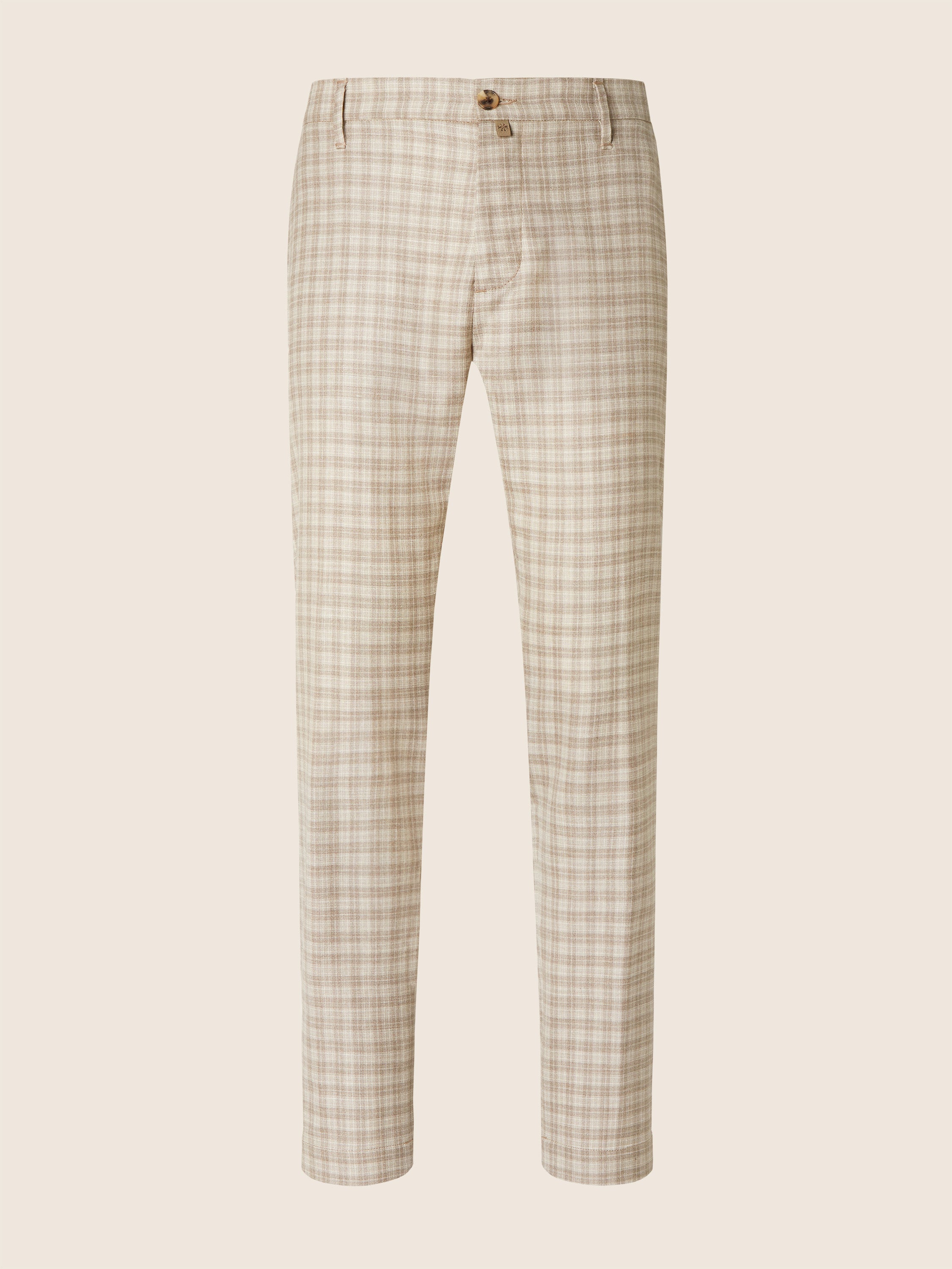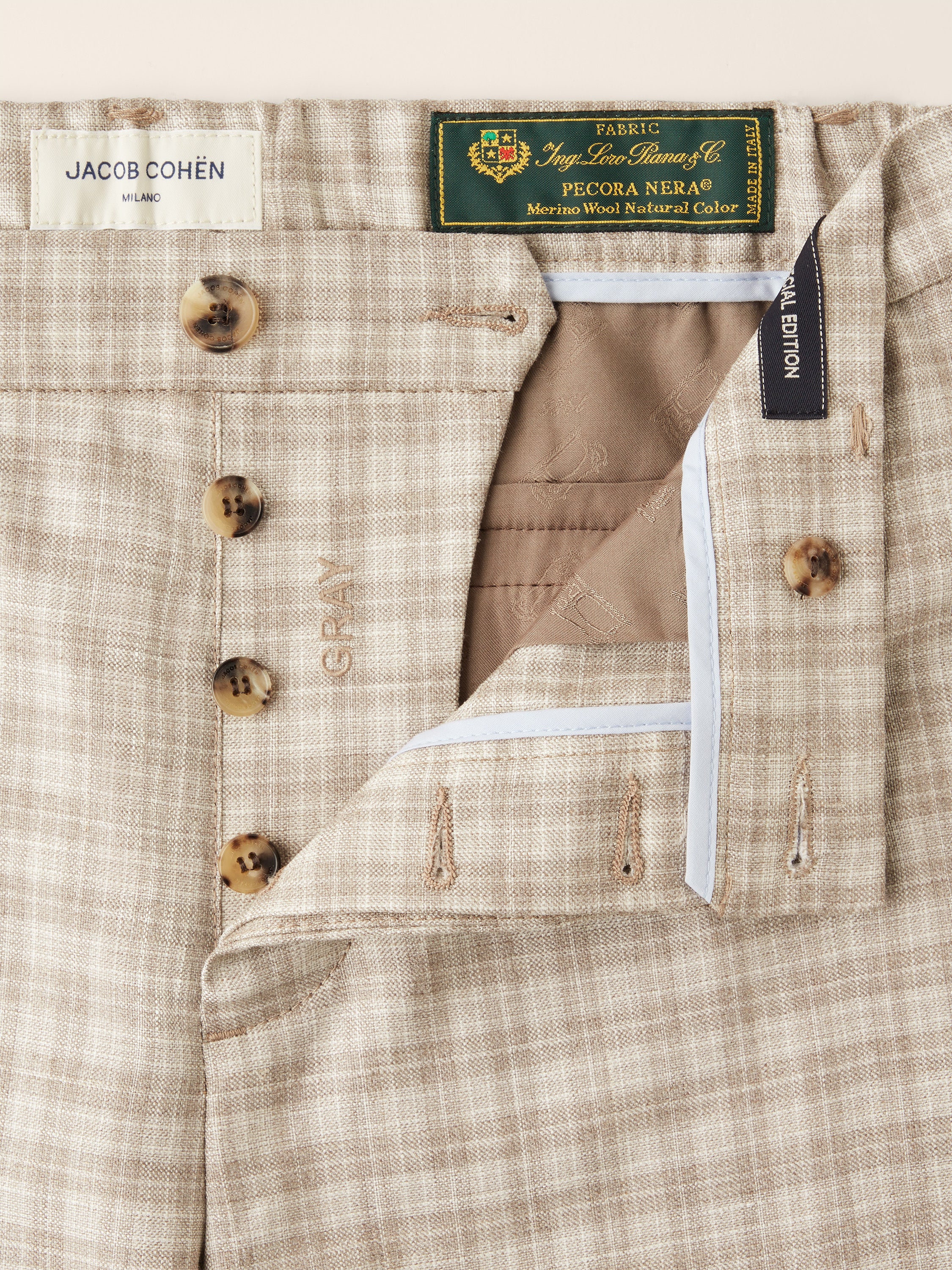 - Premium Loro Piana "Cashmere Raw" fabric in a refined cashmere and silk blend, natural beige with Prince of Wales motif