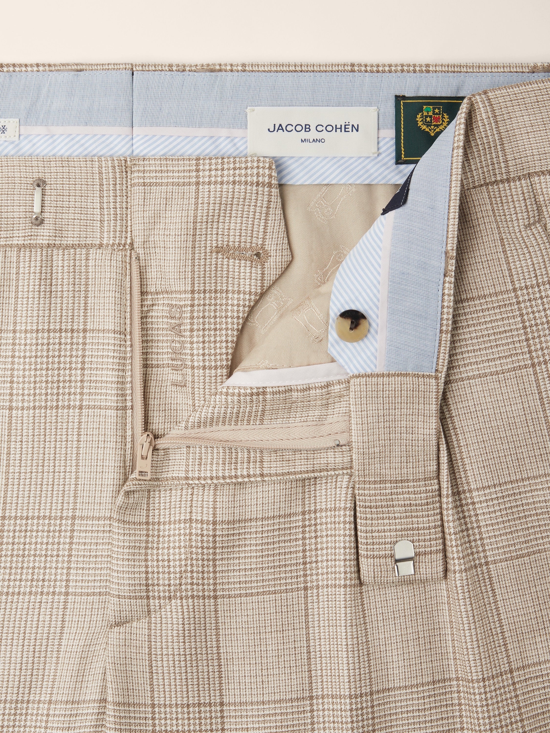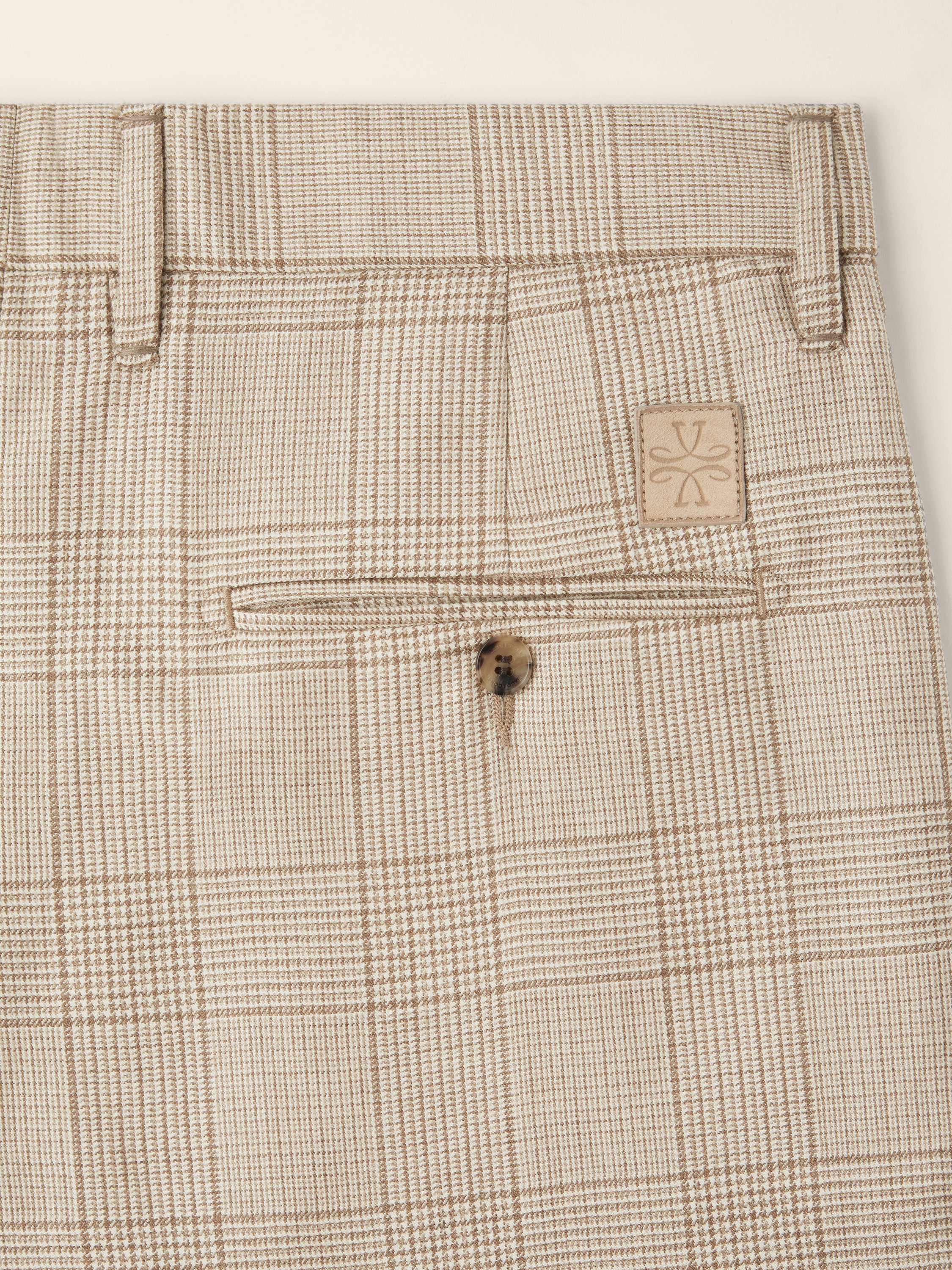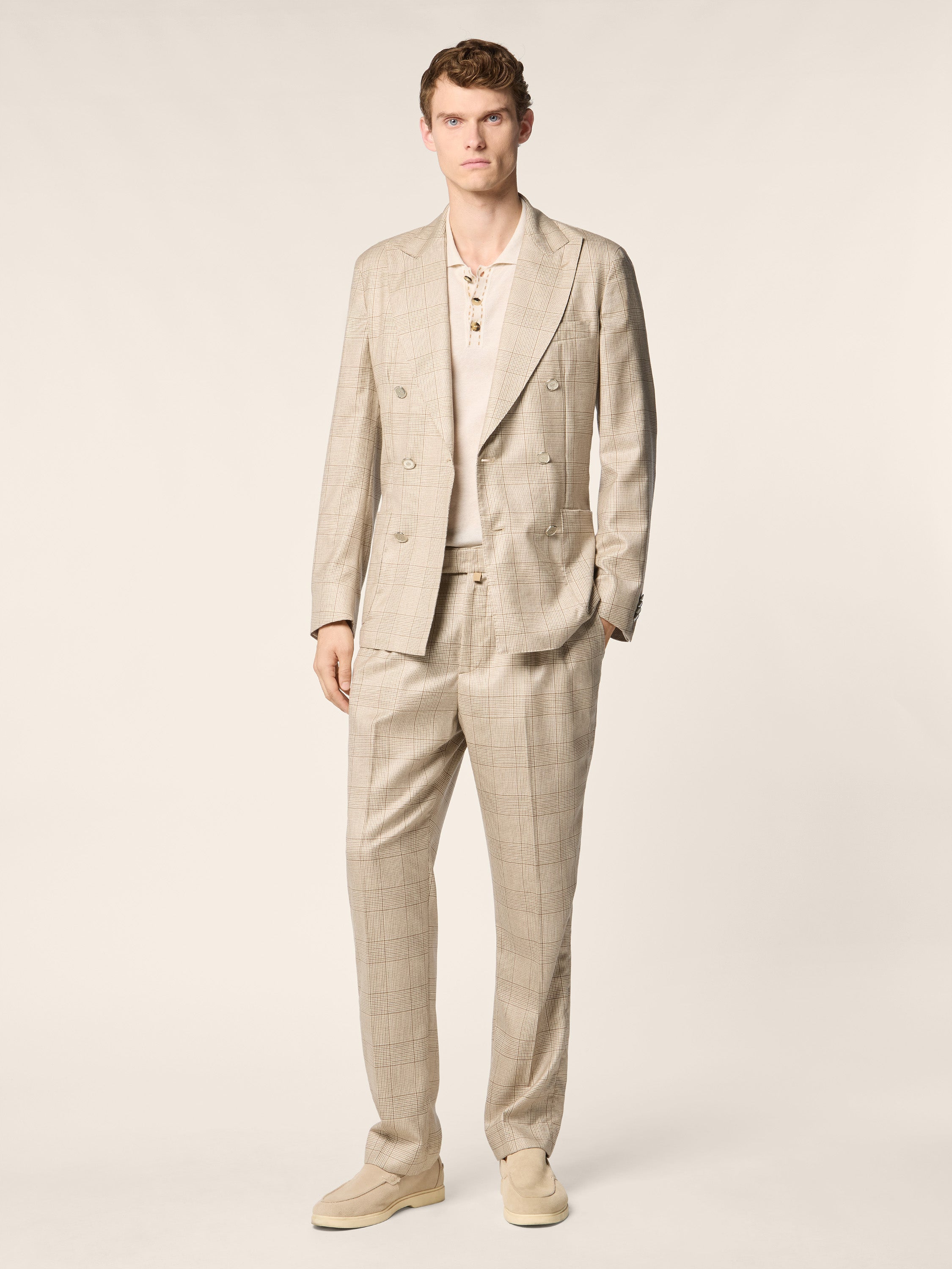 - Premium Loro Piana "Cashmere Raw" fabric in a refined cashmere and silk blend, natural beige with Prince of Wales motif