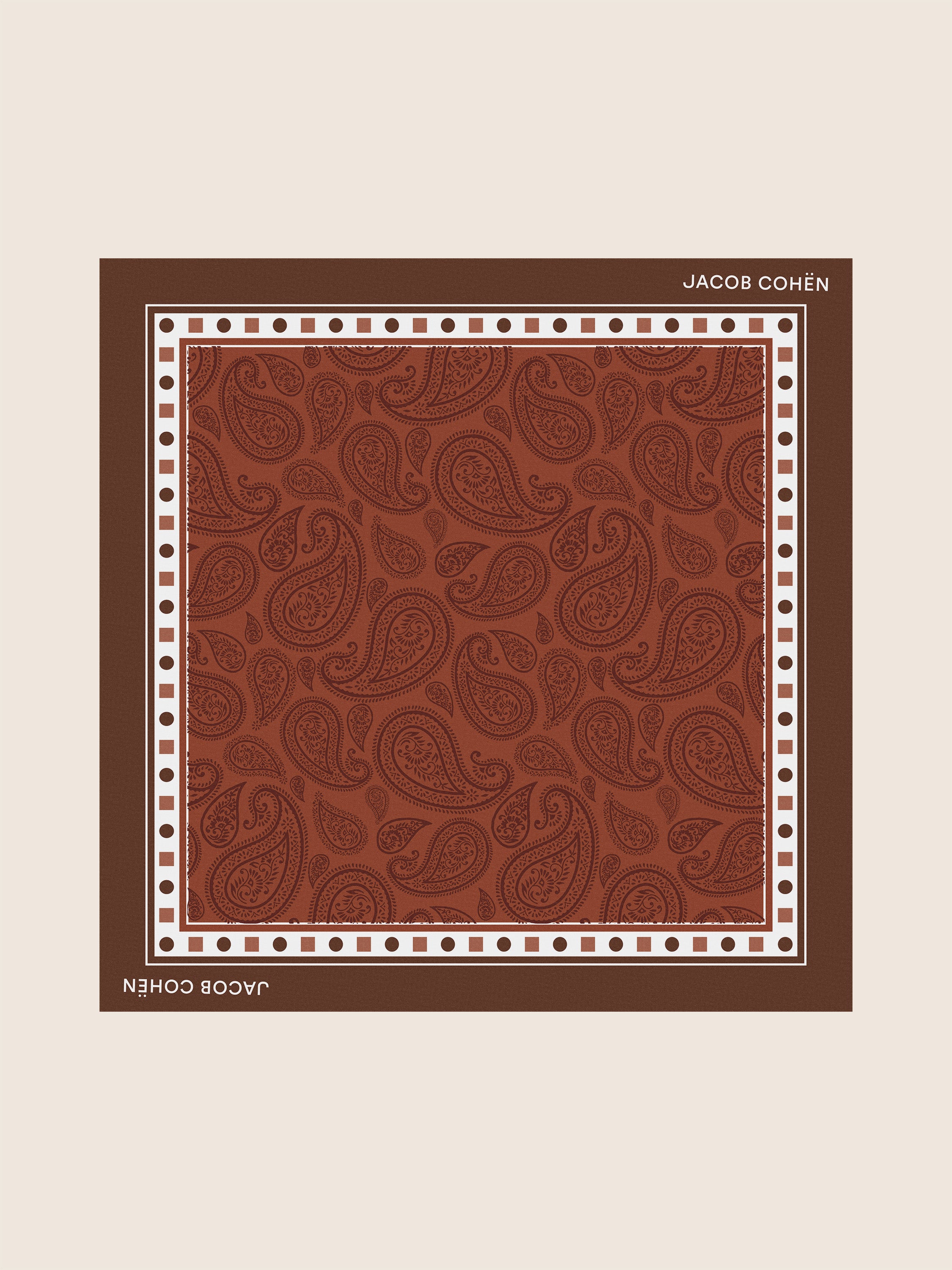 - Terracotta-brown Saffiano leather back patch with Paisley print and inlaid logo in white synthetic-leather