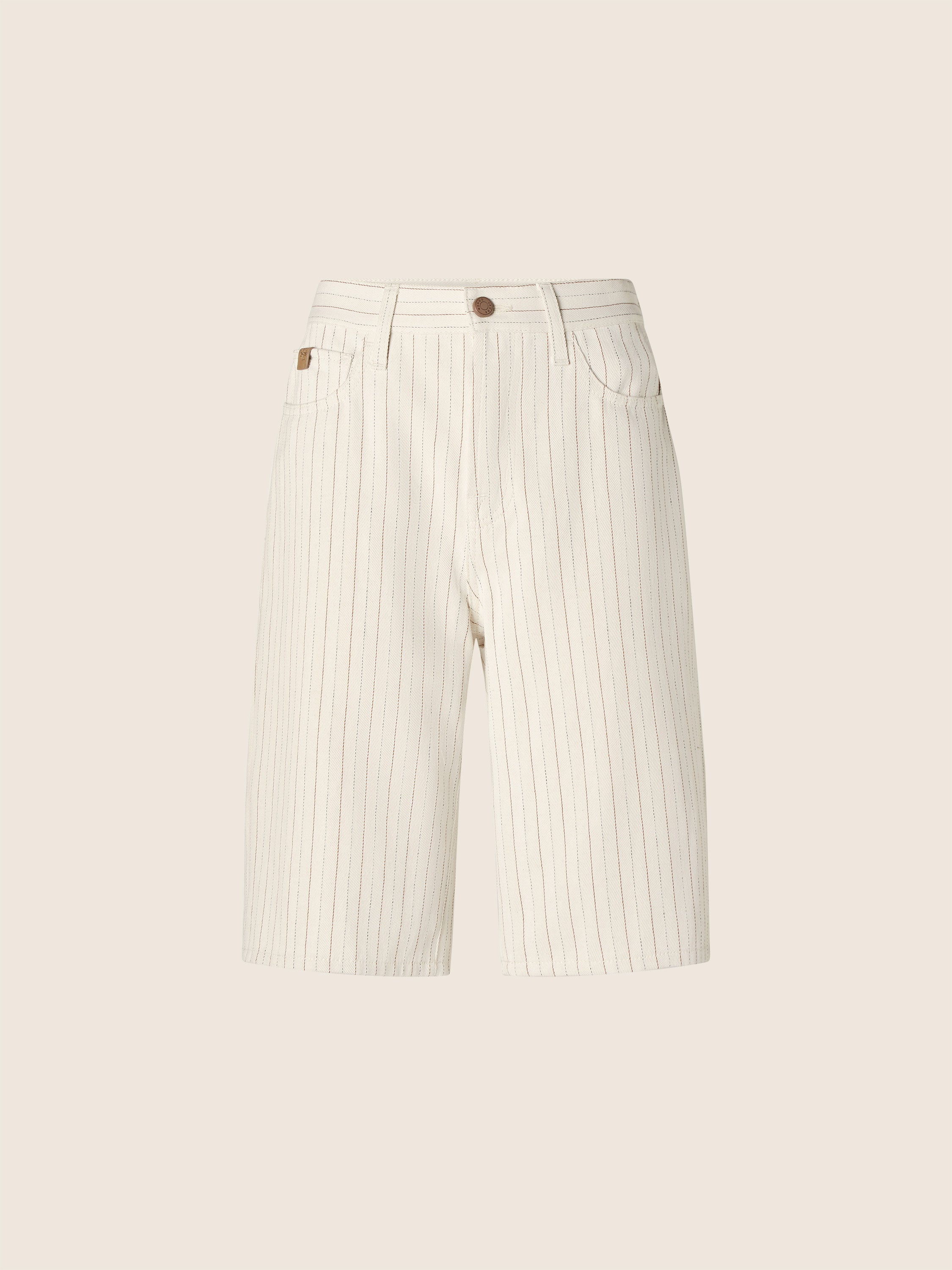 Amber 5 Pocket Bermuda Shorts in Ecru Cotton and Hemp Herringbone Canvas with Cocoa Stripes