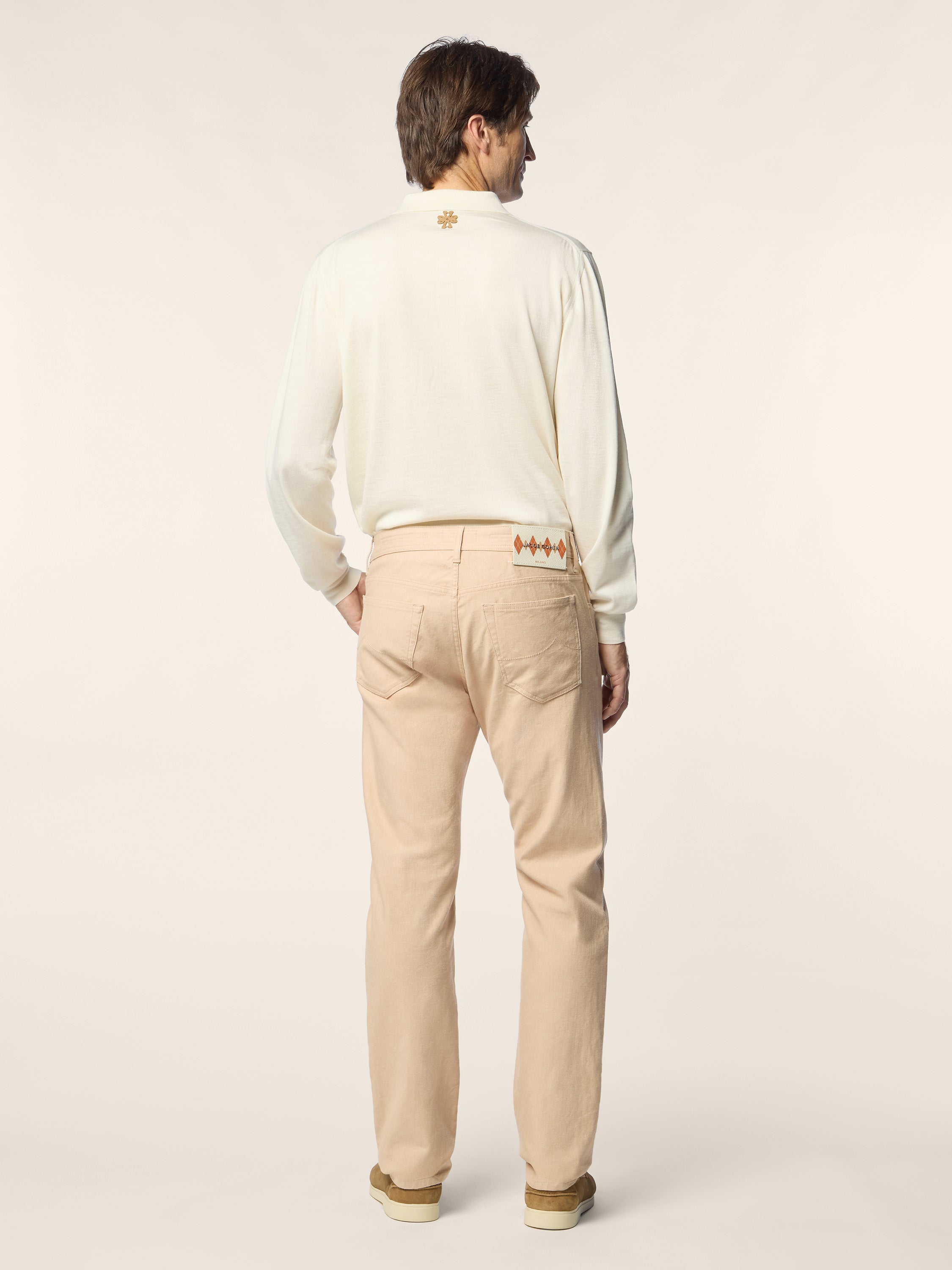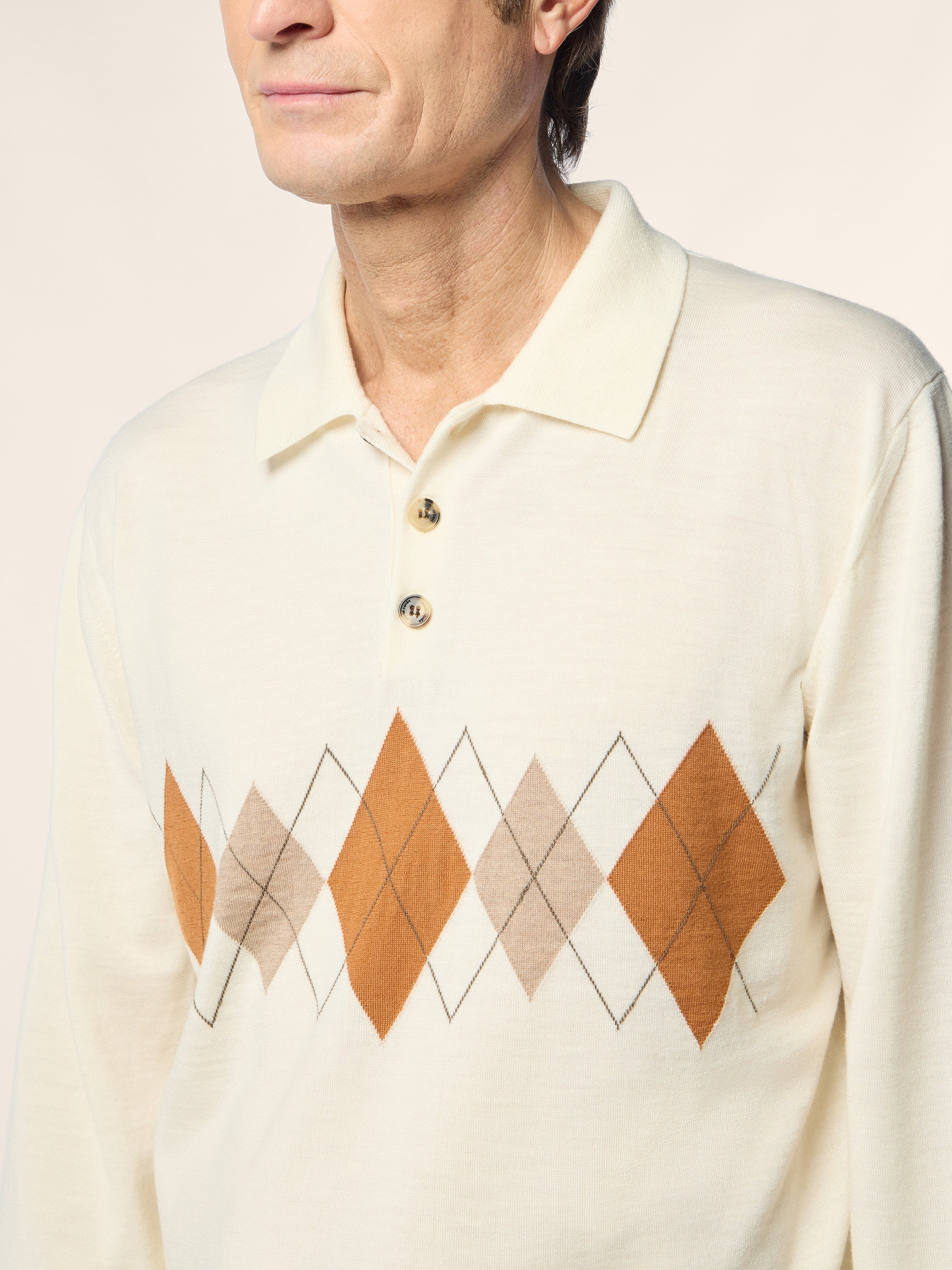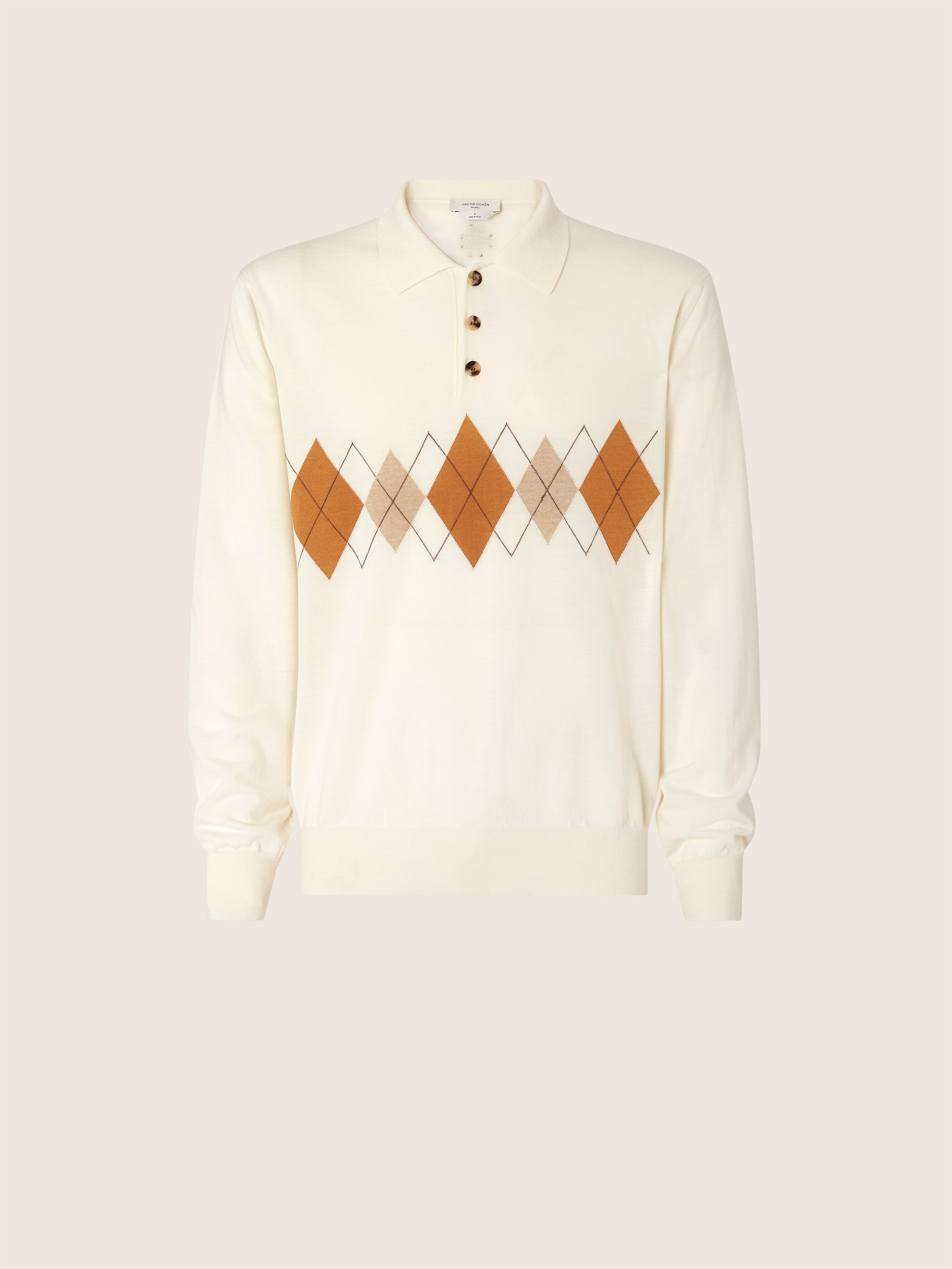 - Pure cashmere jacquard with argyle motif in shades of white, orange and beige, plain stitch gauge 18