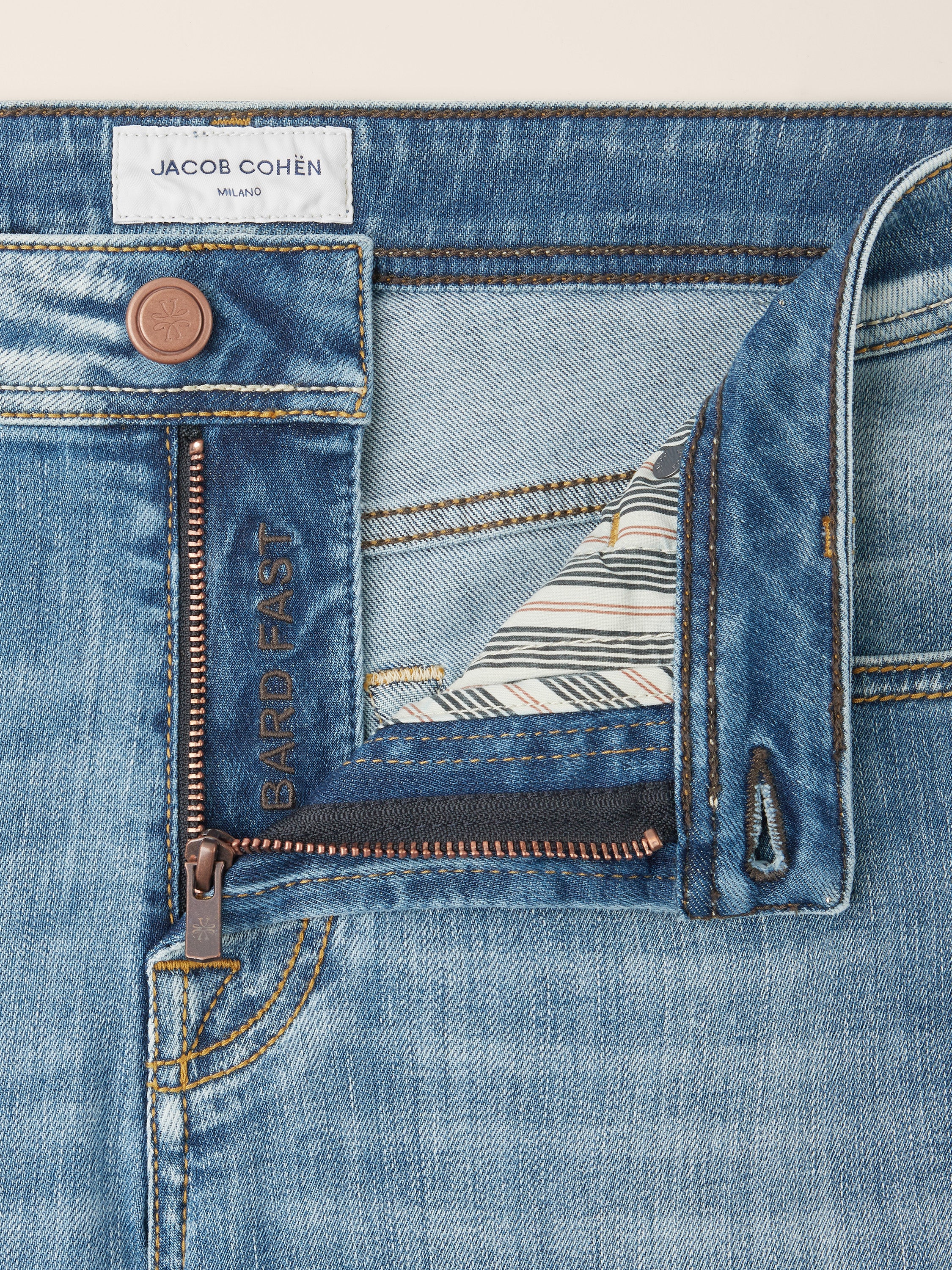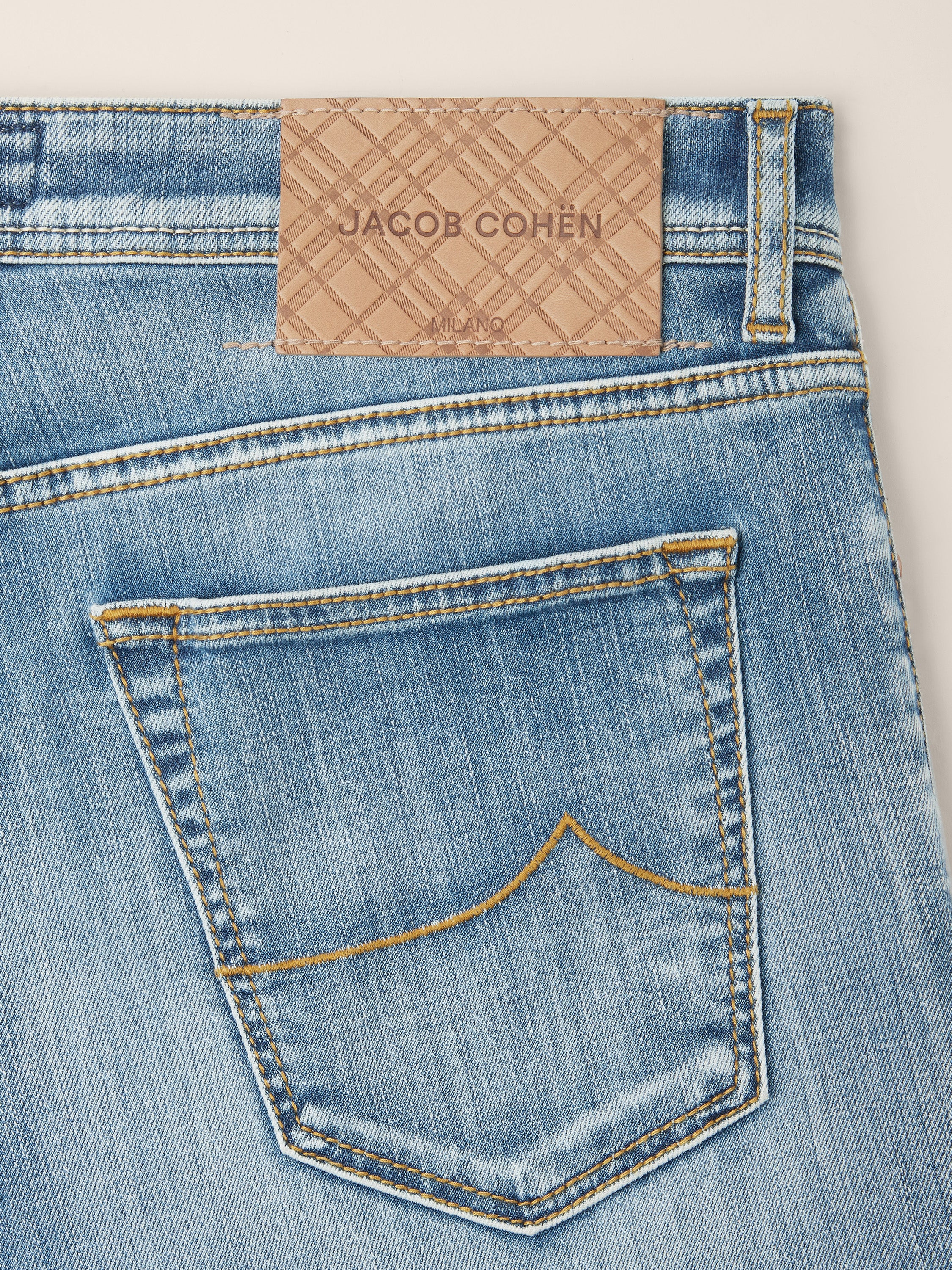 • Medium blue super stretch denim with a vintage-effect stone bleach wash, hand-sanded (10 ounces)