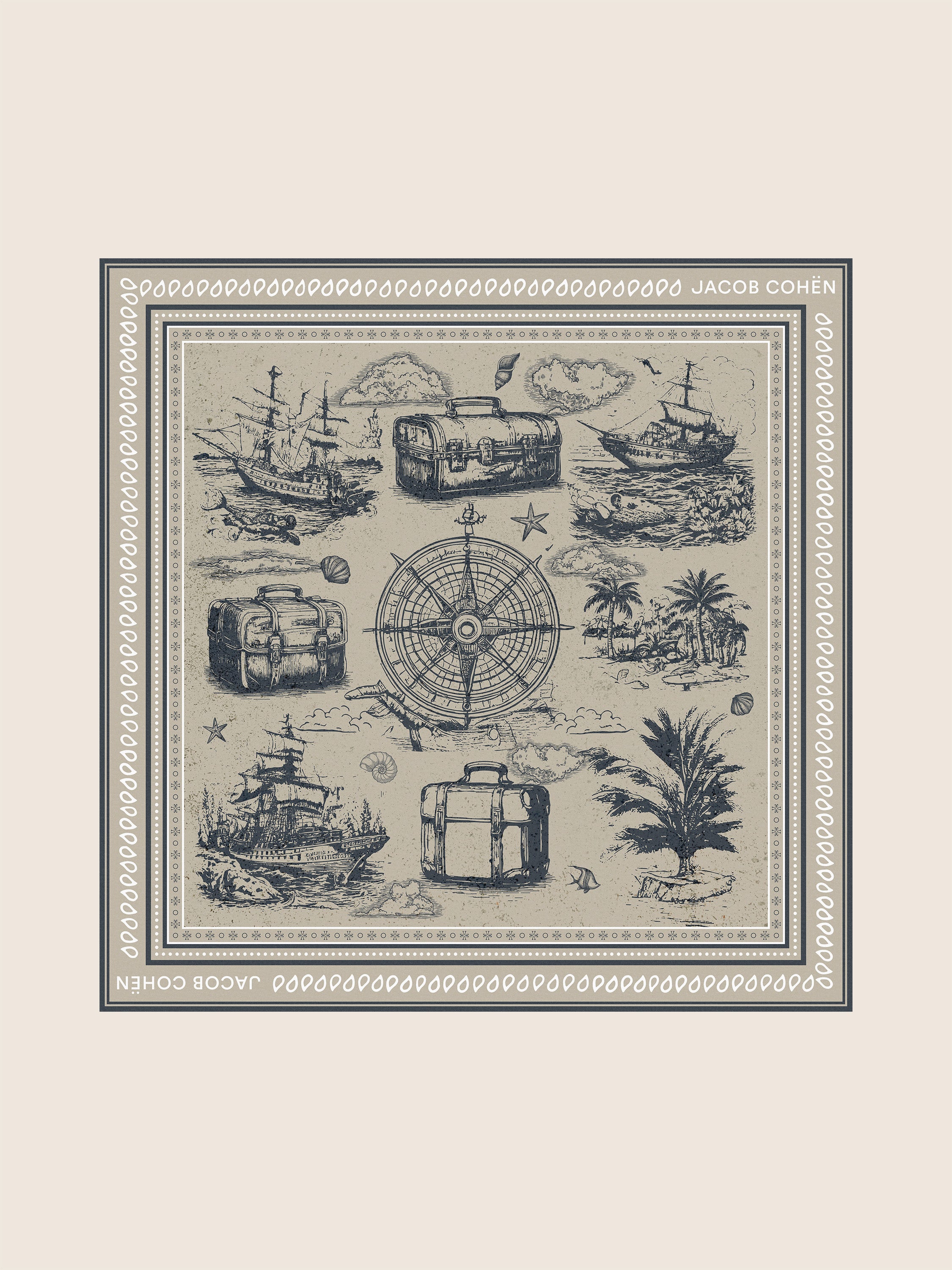 • Includes a cotton bandana with vintage-style travel drawings in shades of navy blue, and spool of thread