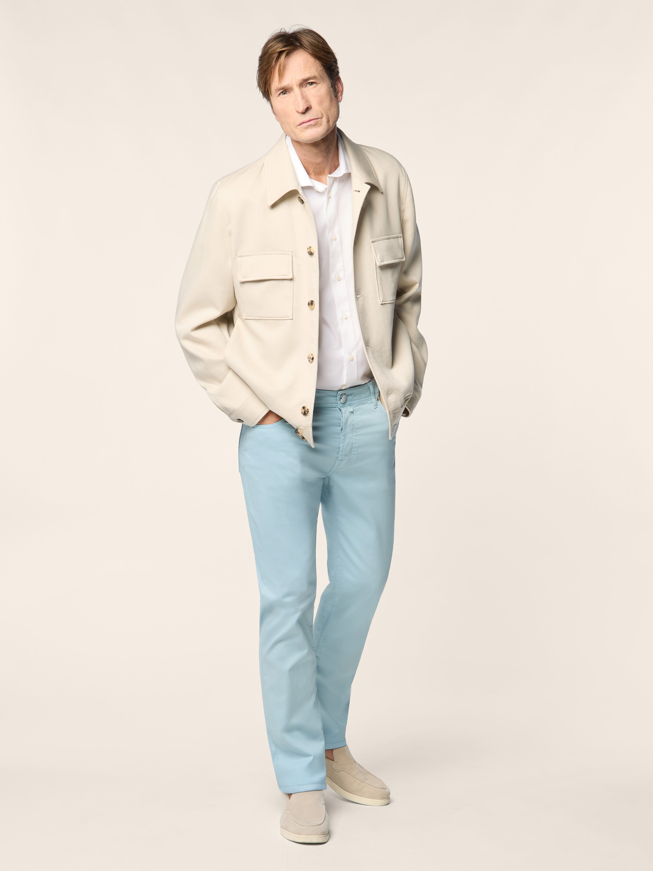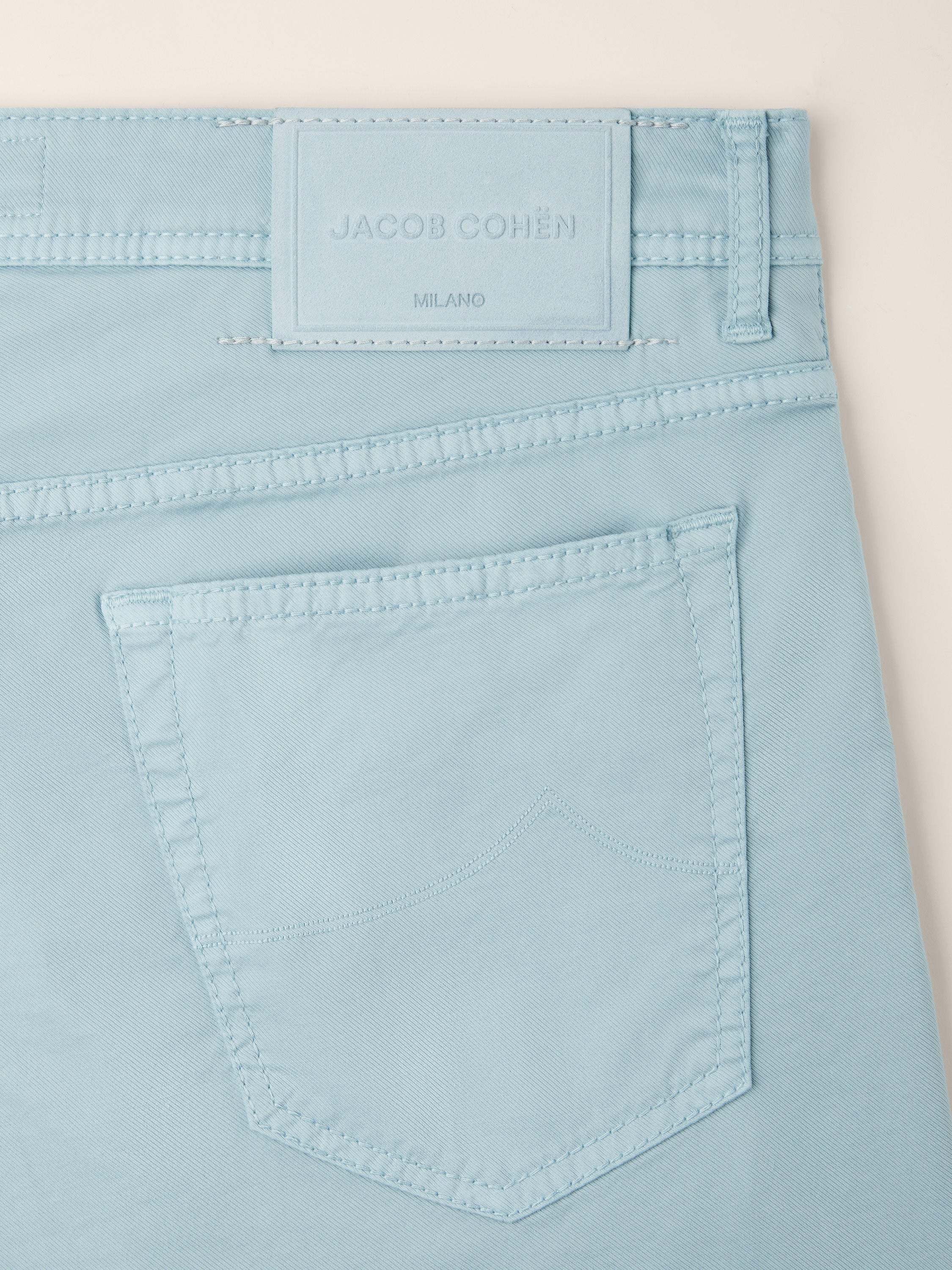 - Sky blue stretch cotton and Lyocell diagonal twill, garment dyed