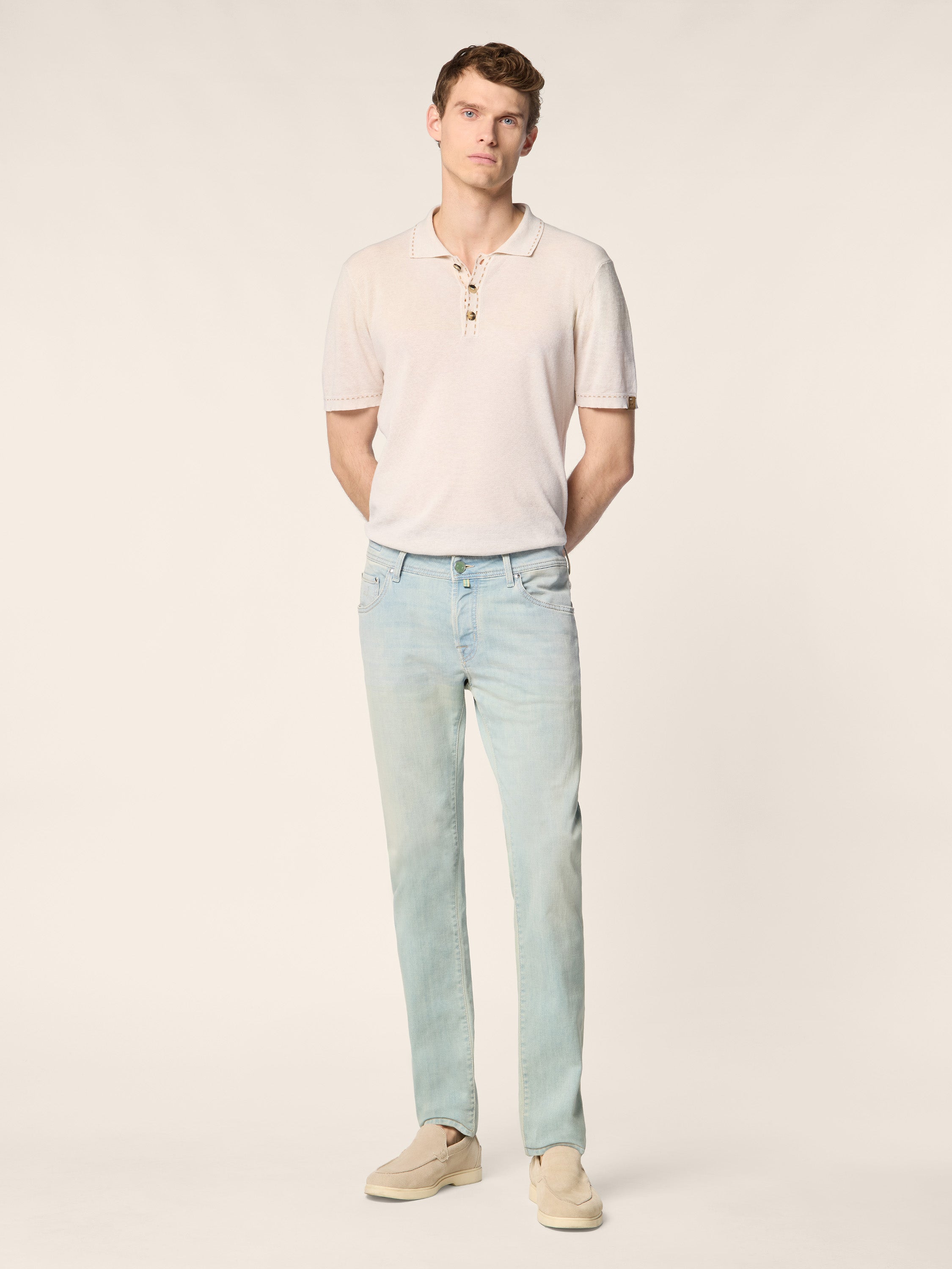 • Light blue power stretch denim with a vintage-effect stone wash, enriched with whiskers, bleach treatments and a dirt-effect finish, hand sanded (9 ounces)