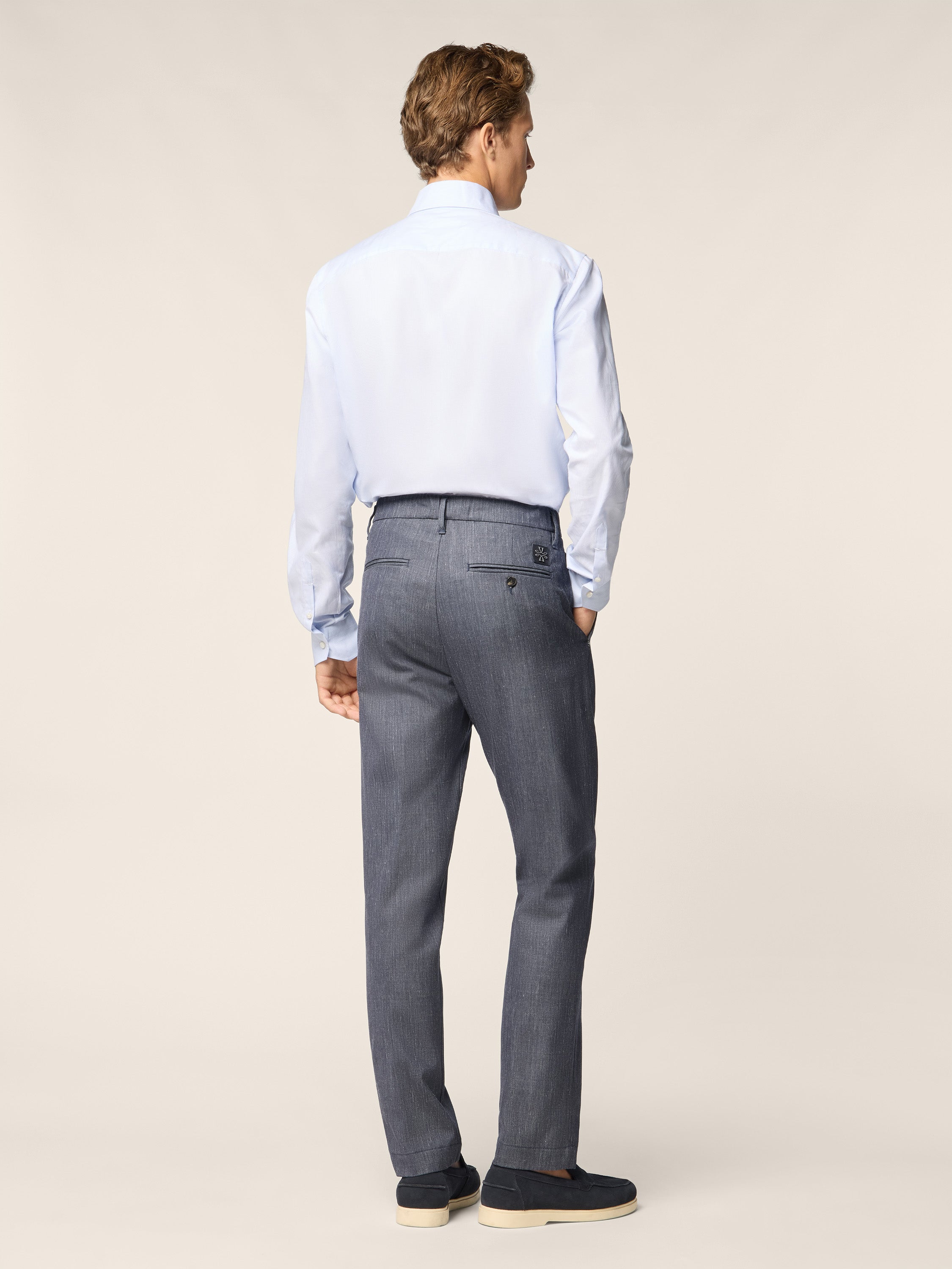 Gray Regular Chino Pants in Denim Blue Melange Wool, Silk and Linen Stretch Gabardine Loro Piana