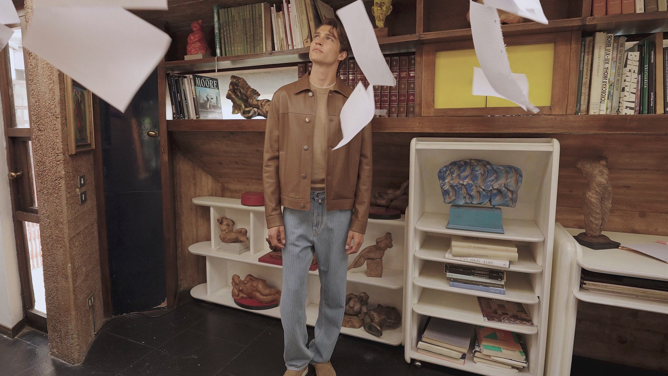 There are the exclusive collaborations of Loro Piana Pecora Nera fabrics, for shirts and trousers in natural colours, contrasting the natural palettes of the Raw Cashmere garments. And again, the precious Loro Piana silk, linen and fine wool fabrics. The savoir-faire of today. The elegance of the lightest suede, in the tones of a shy pink, translates into a trucker jacket with elongated forms. In shades of tobacco, rather, are the over-shirts with clear references to denim shirts or the zipped jackets. Deerskin adds character and refinement to jackets and outerwear, exalting the softness and comfort. Lightness and fluidity likewise typify fine waterproof wool, a surprising fabric for beach shorts and windbreakers. An almost impalpable jersey and breathy cashmere characterise polo shirts with or without buttons. The tones range from faded pink, beige, ice, to all shades of blue. Sea Island cotton describes basic garments with precise lines and volumes, impeccable cuts and meticulous finishes.