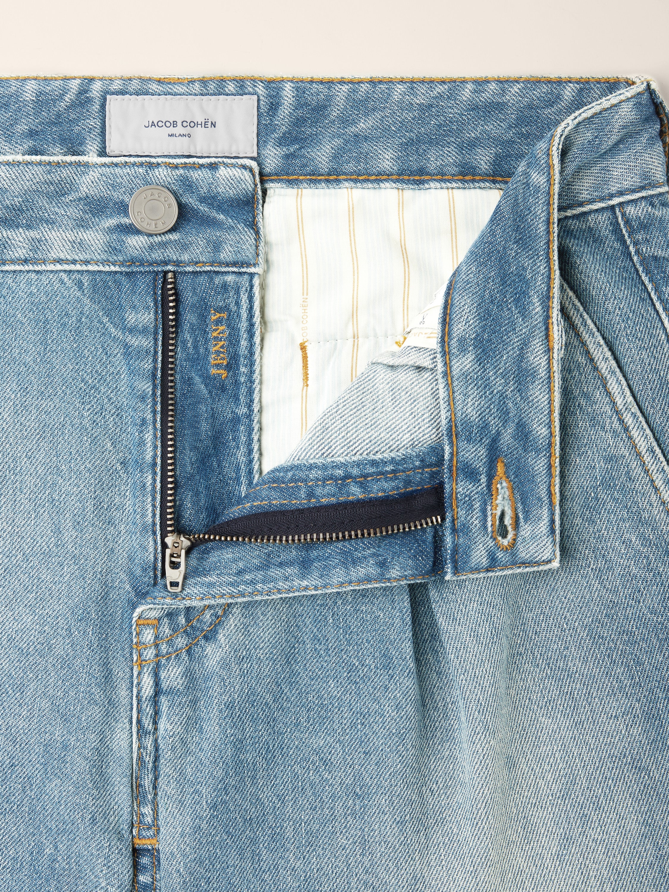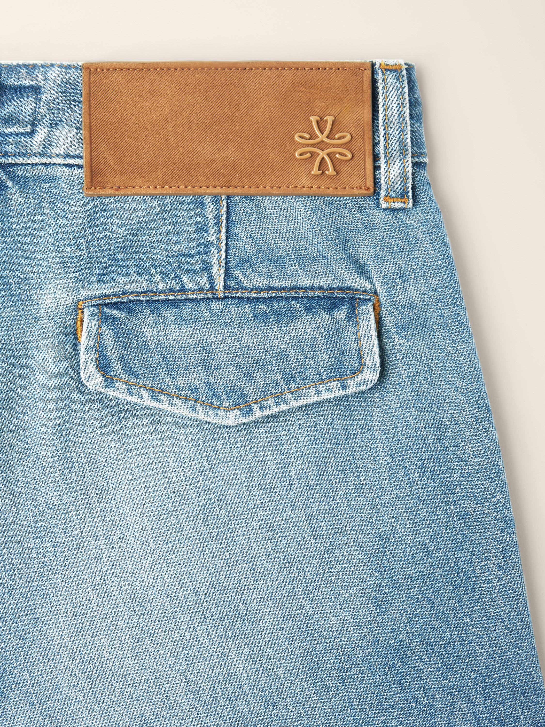 - Medium blue cotton and lyocell denim with a vintage-effect stone wash, enriched with bleach treatments, sanding and a resin finish that lends depth and tone to the fabric, paired with subtle shading and dirt detailing (11 ounces)