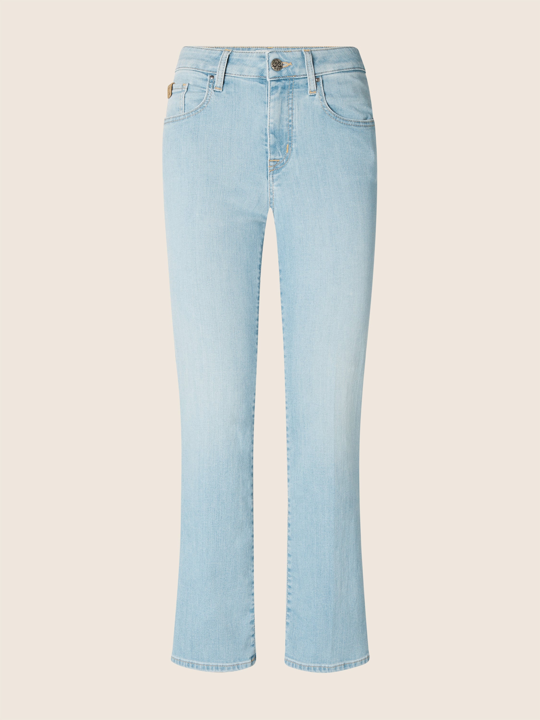 - Kate Crop 5 pocket jeans with a straight fit, high waist, and cropped hem
