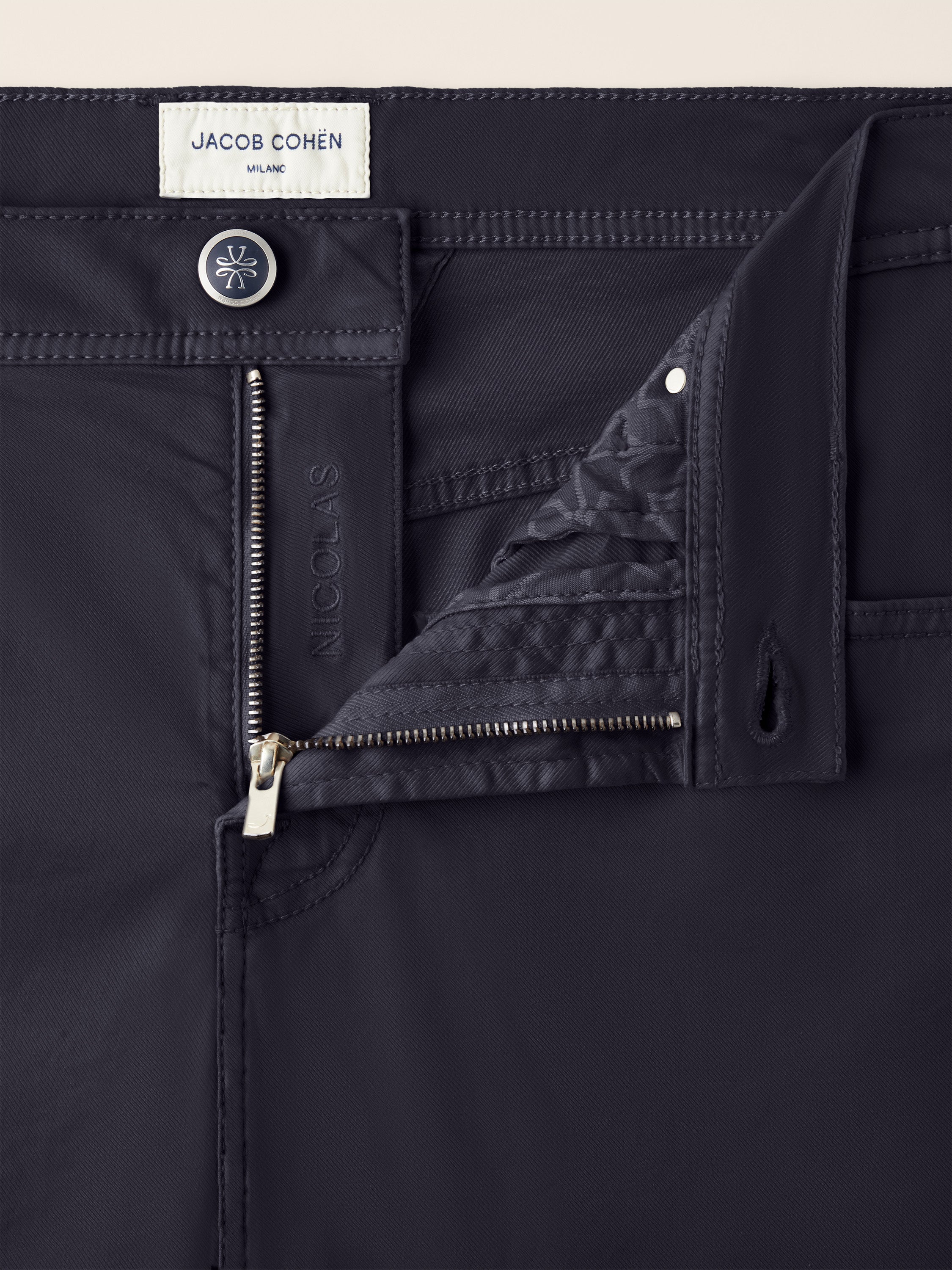 - Navy blue stretch cotton and Lyocell diagonal twill, garment dyed