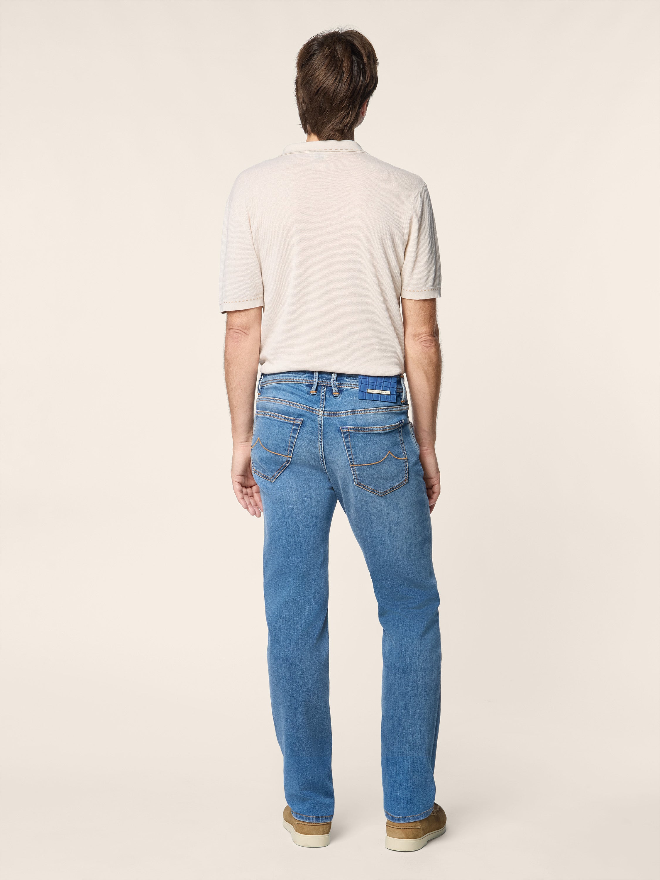 Bard Regular-Slim 5 Pocket Jeans in Medium Blue Super Stretch Soft Denim with Vintage Wash