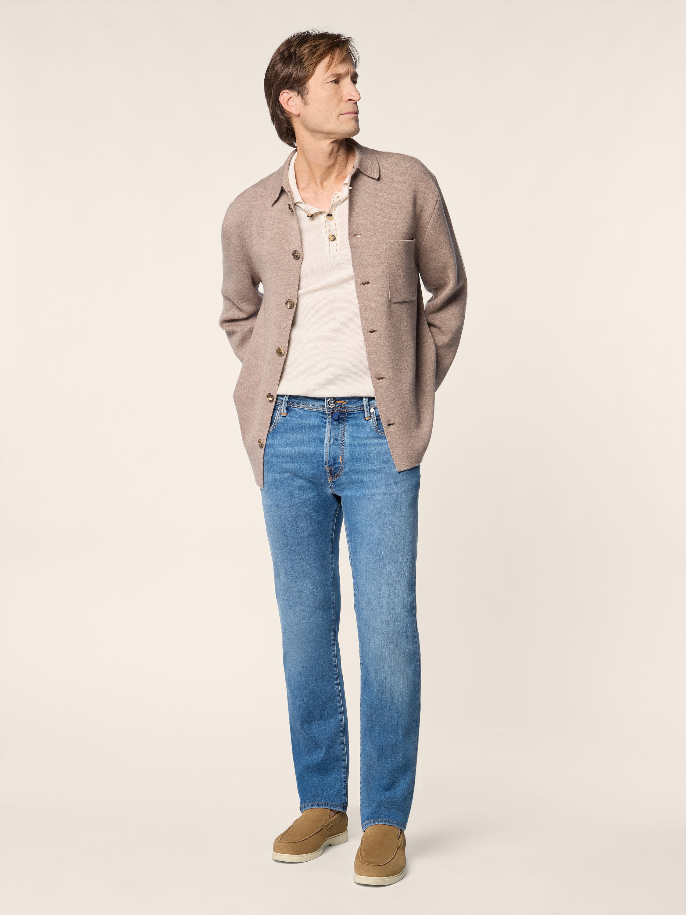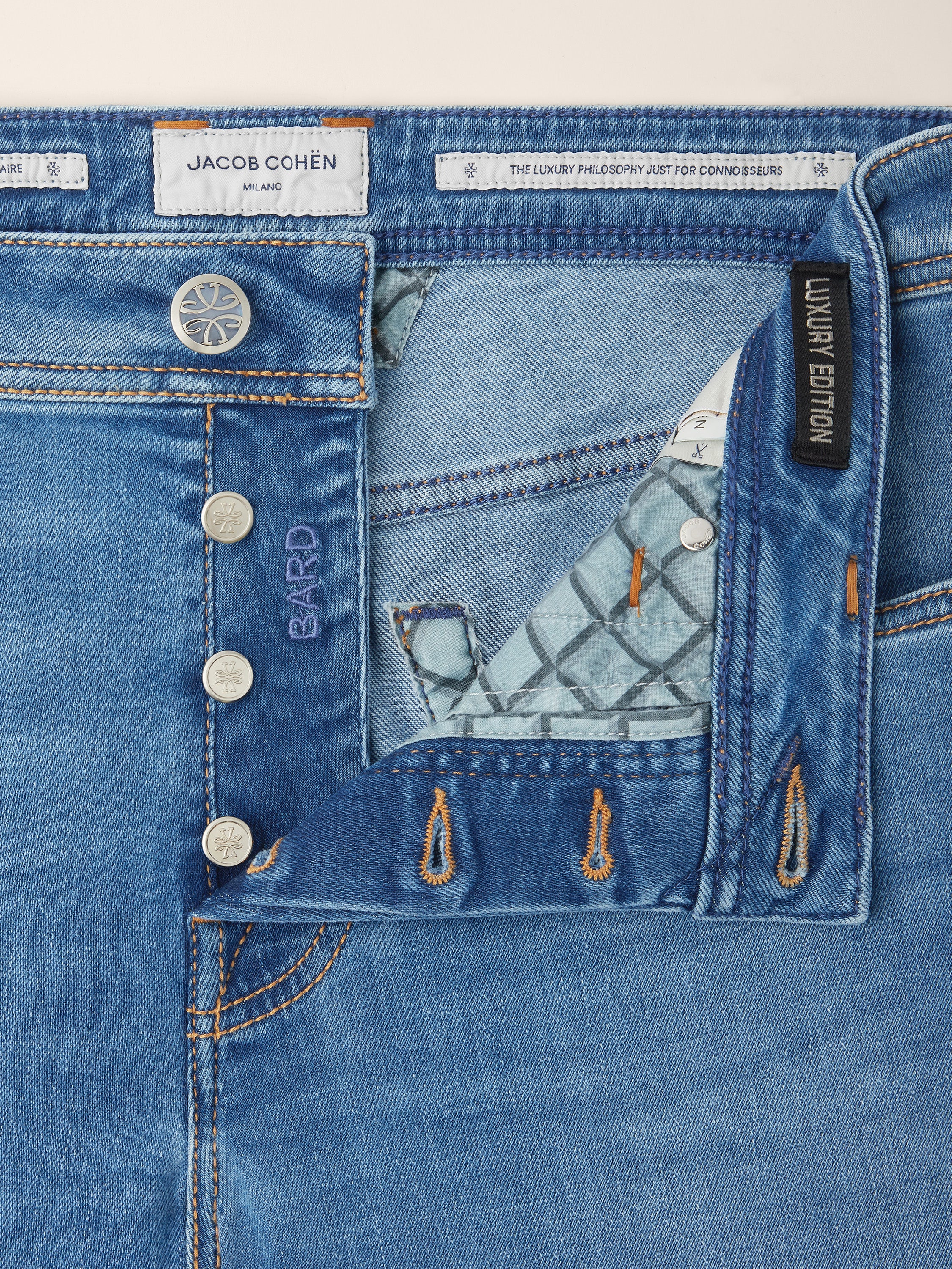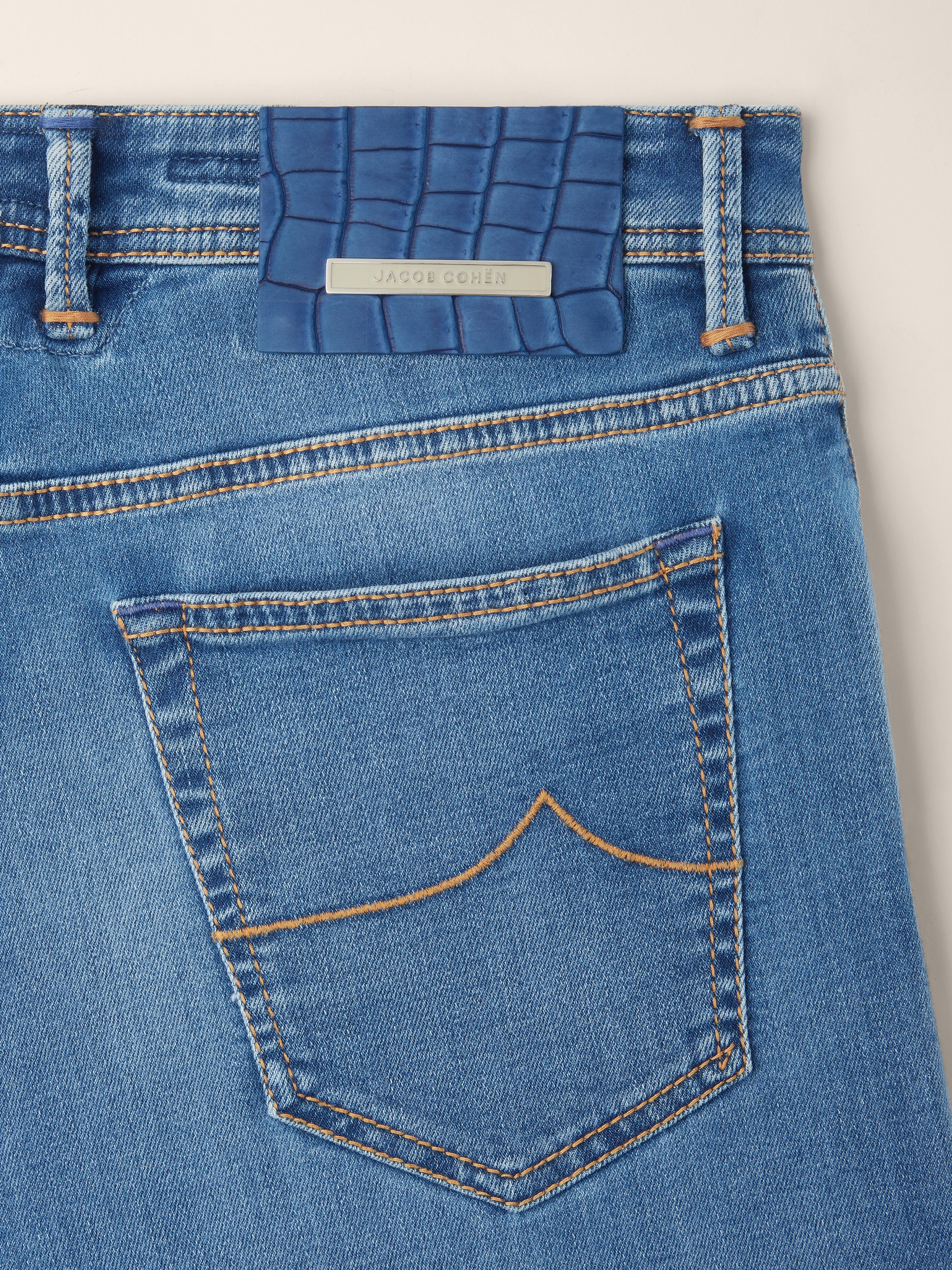 - Medium blue luxury super stretch soft denim with a vintage-effect wash, detailed with whiskers and shading, hand sanded (10 ounces)