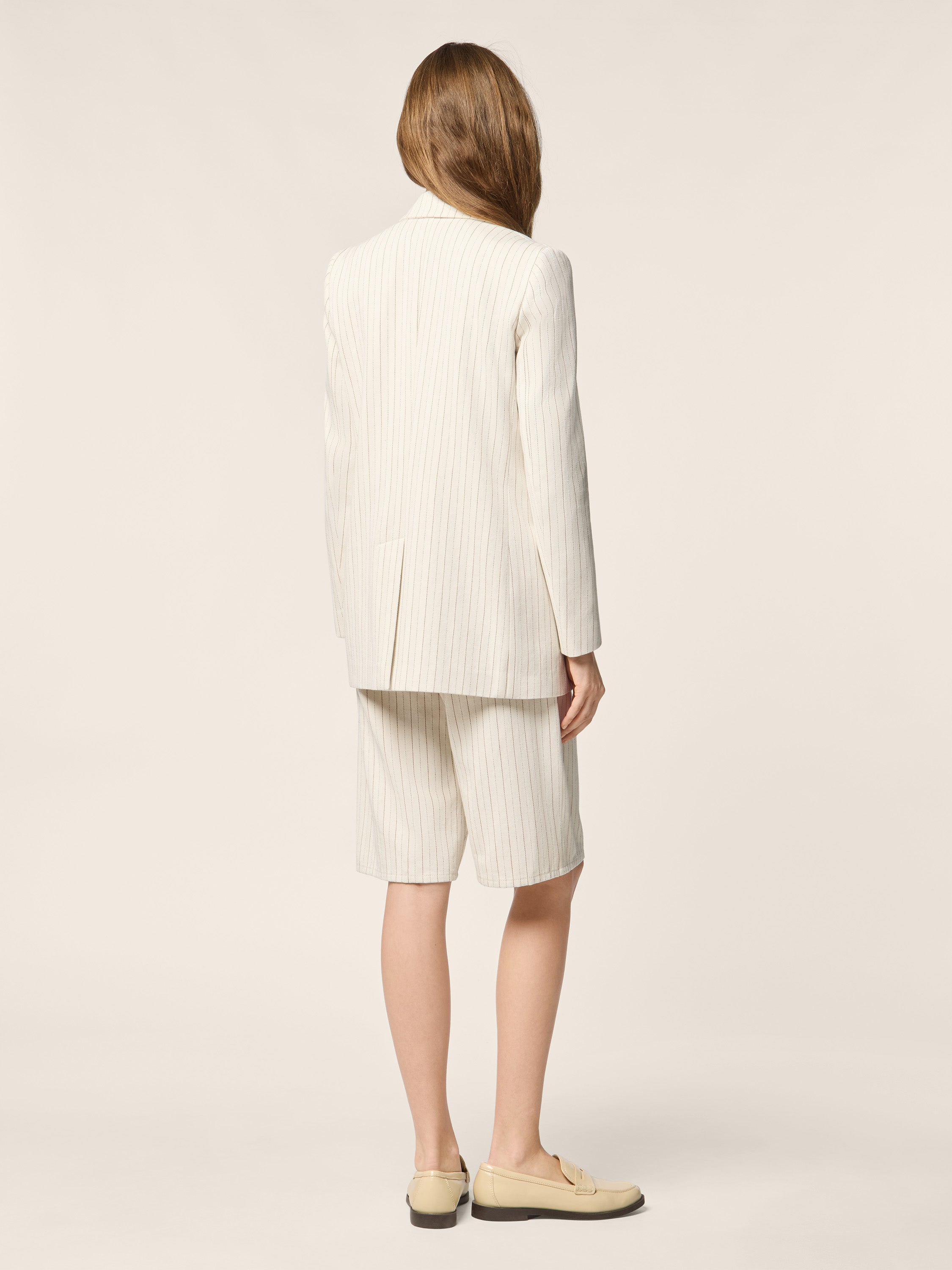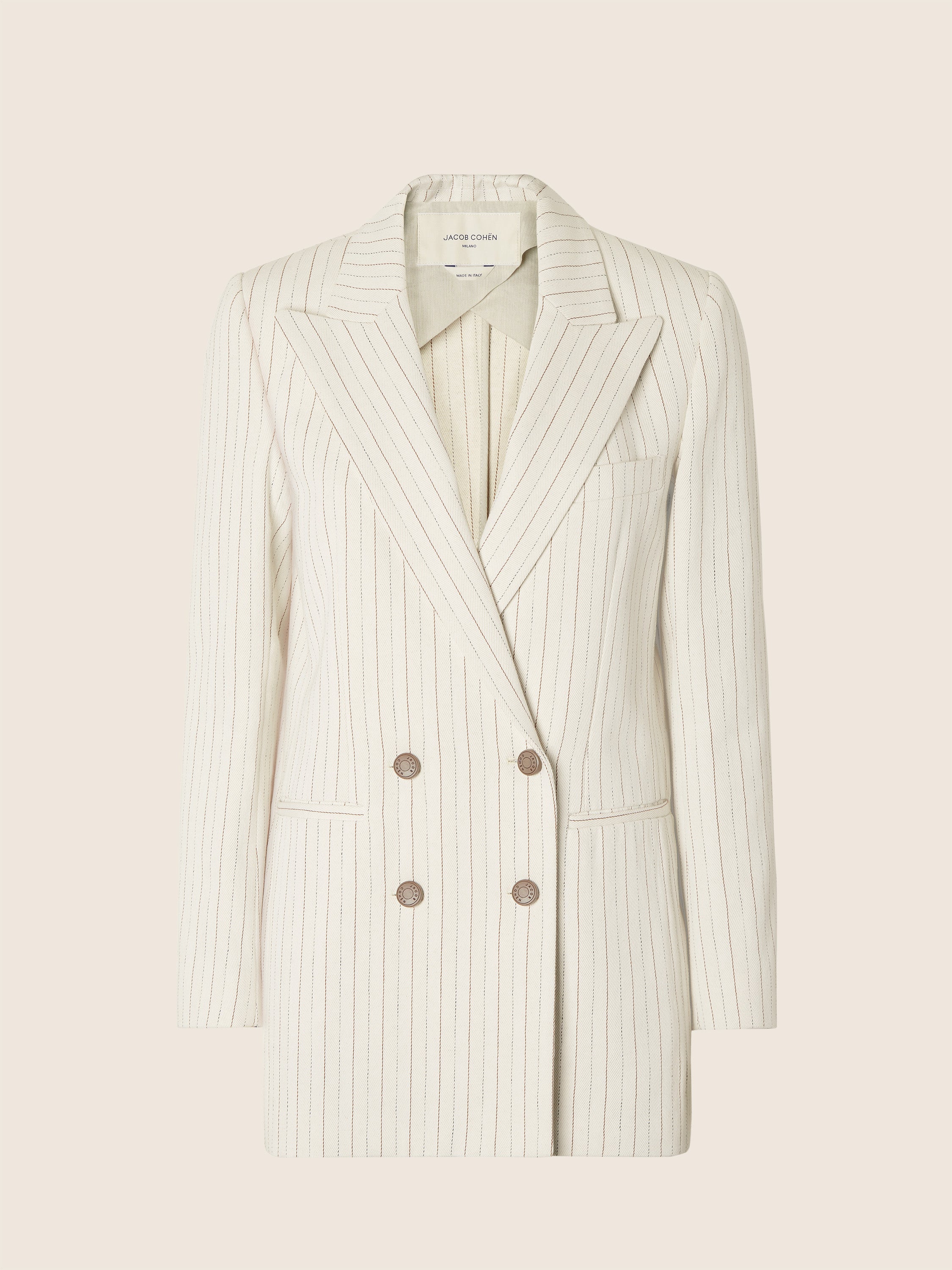 Unstructured Blazer in Ecru Cotton and Hemp Herringbone Canvas with Cocoa Stripes